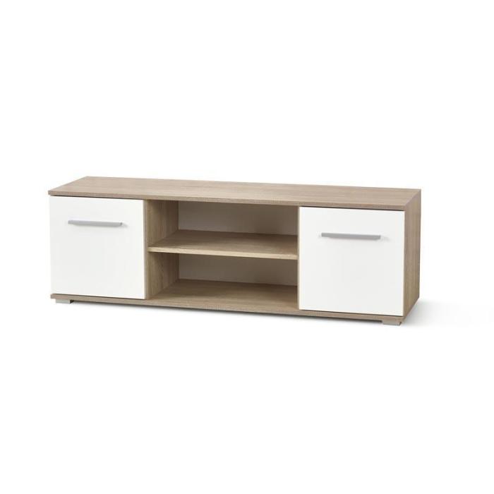 Fronty wykonane są z płyty meblowej w odcieniach dąb sonoma i biały, a korpus z płyty meblowej lakierowanej w kolorze dąb sonoma. Matowe wykończenie eliminuje odblaski światła, nadając szafce elegancki i stonowany wygląd. Połączenie naturalnego drewna z bielą sprawia, że szafka wpasuje się zarówno w jasne, jak i ciemniejsze wnętrza, wprowadzając harmonię i przytulność do salonu lub pokoju multimedialnego.