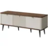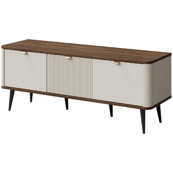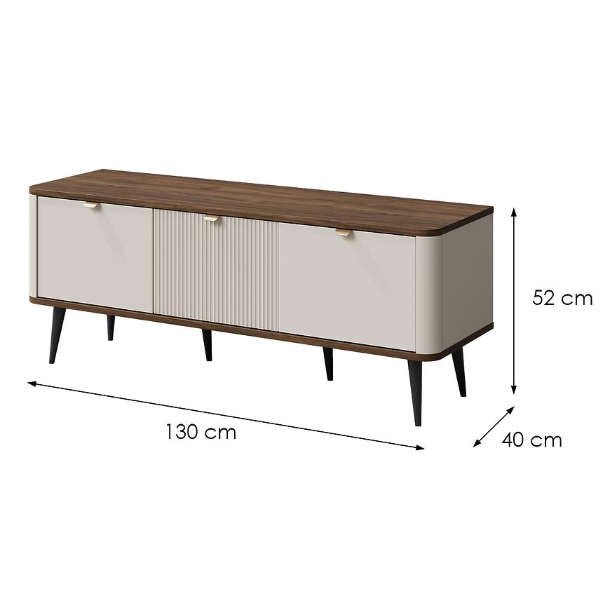 Szafka RTV Marly 14 o szerokości 130 cm w kolorze orzech/kashmir to stylowy mebel, który łączy ciepło naturalnego drewna z delikatną nutą nowoczesności. Wybarwienie orzecha dodaje wnętrzu przytulności i klasy, a fronty w kolorze kashmir wprowadzają subtelny, jasny akcent, który pięknie równoważy całość.