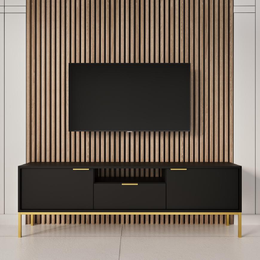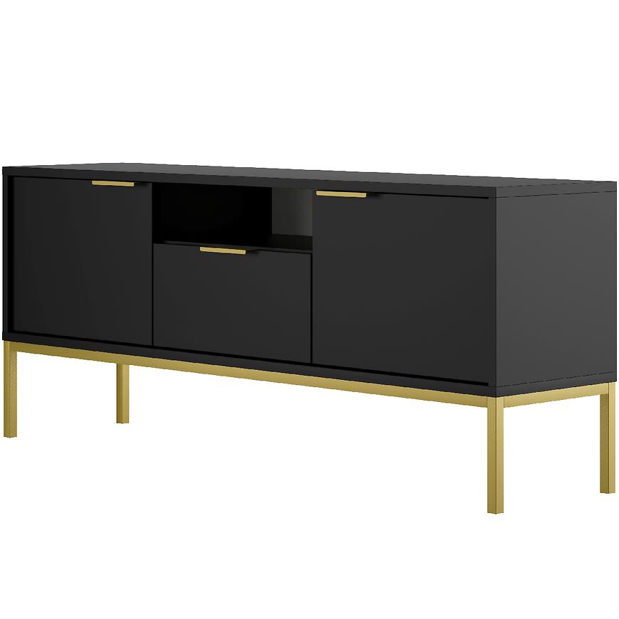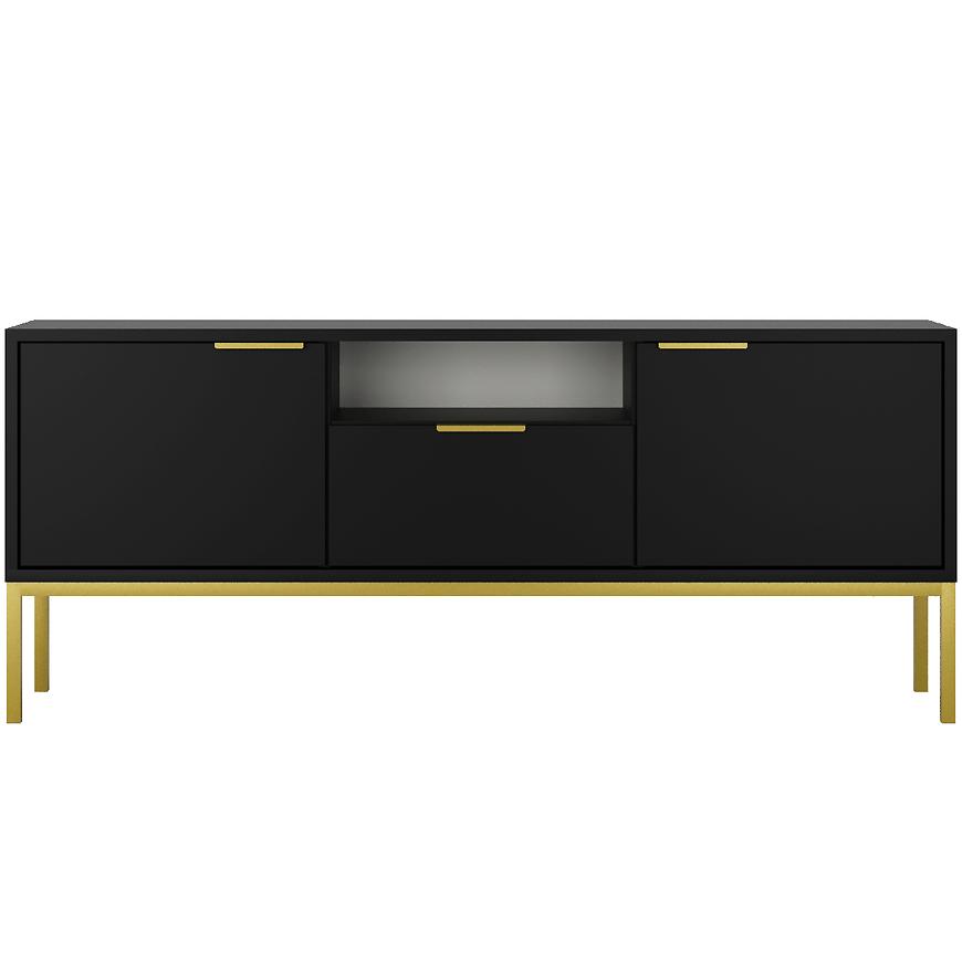 Szafka RTV w kolorze Czarny/Złoty z kolekcji Austin to stylowe i funkcjonalne rozwiązanie do nowoczesnych wnętrz. Jej minimalistyczny design doskonale komponuje się z różnymi aranżacjami, wprowadzając do salonu elegancję i porządek. Konstrukcja wykonana z laminowanej płyty wiórowej gwarantuje trwałość i odporność na codzienne użytkowanie, a matowe wykończenie nadaje całości subtelnej elegancji.