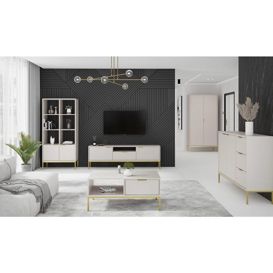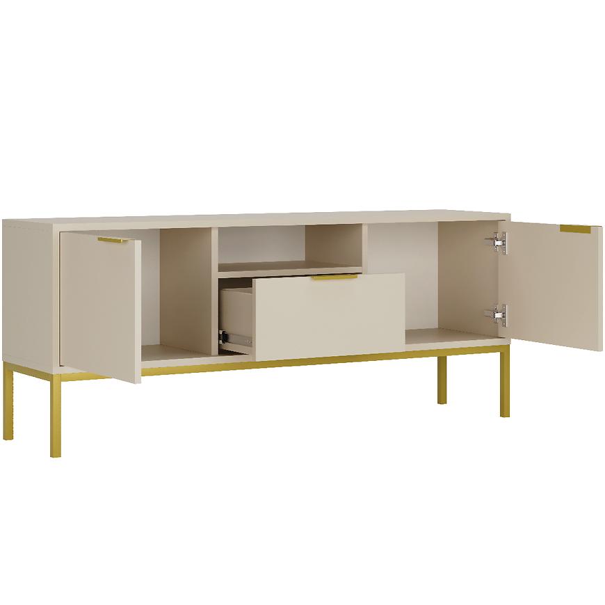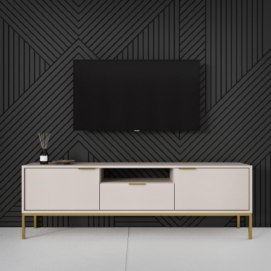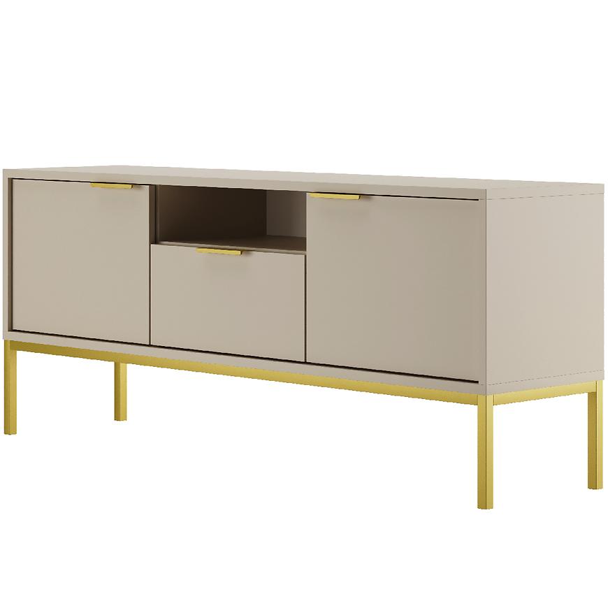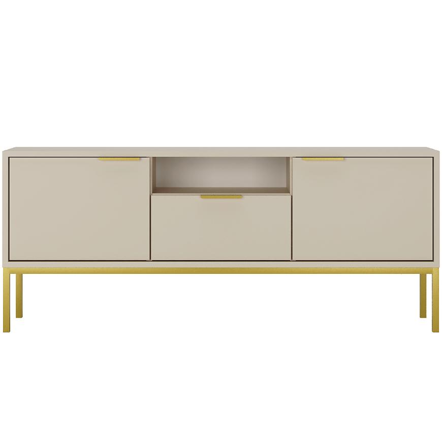 Szafka RTV w kolorze Kaszmir/złoty z kolekcji Austin to stylowe i funkcjonalne rozwiązanie do nowoczesnych wnętrz. Jej minimalistyczny design doskonale komponuje się z różnymi aranżacjami, wprowadzając do salonu elegancję i porządek. Konstrukcja wykonana z laminowanej płyty wiórowej gwarantuje trwałość i odporność na codzienne użytkowanie, a matowe wykończenie nadaje całości subtelnej elegancji.