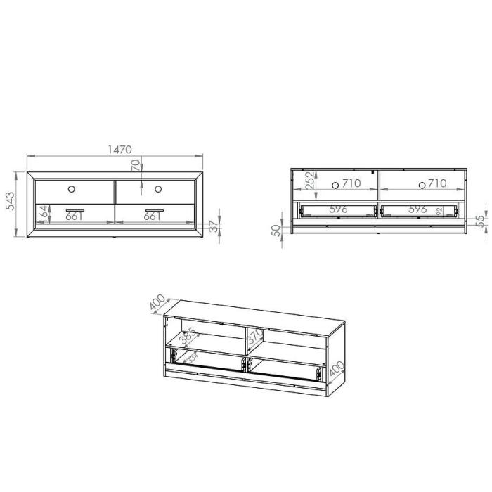 Szafka RTV to kolejny niezbędny element w nowoczesnym pokoju dziennym. Z dwiema szufladami i dwoma półkami zapewnia funkcjonalne miejsce do przechowywania sprzętu multimedialnego oraz dodatkowego miejsca na dekoracje czy inne akcesoria.