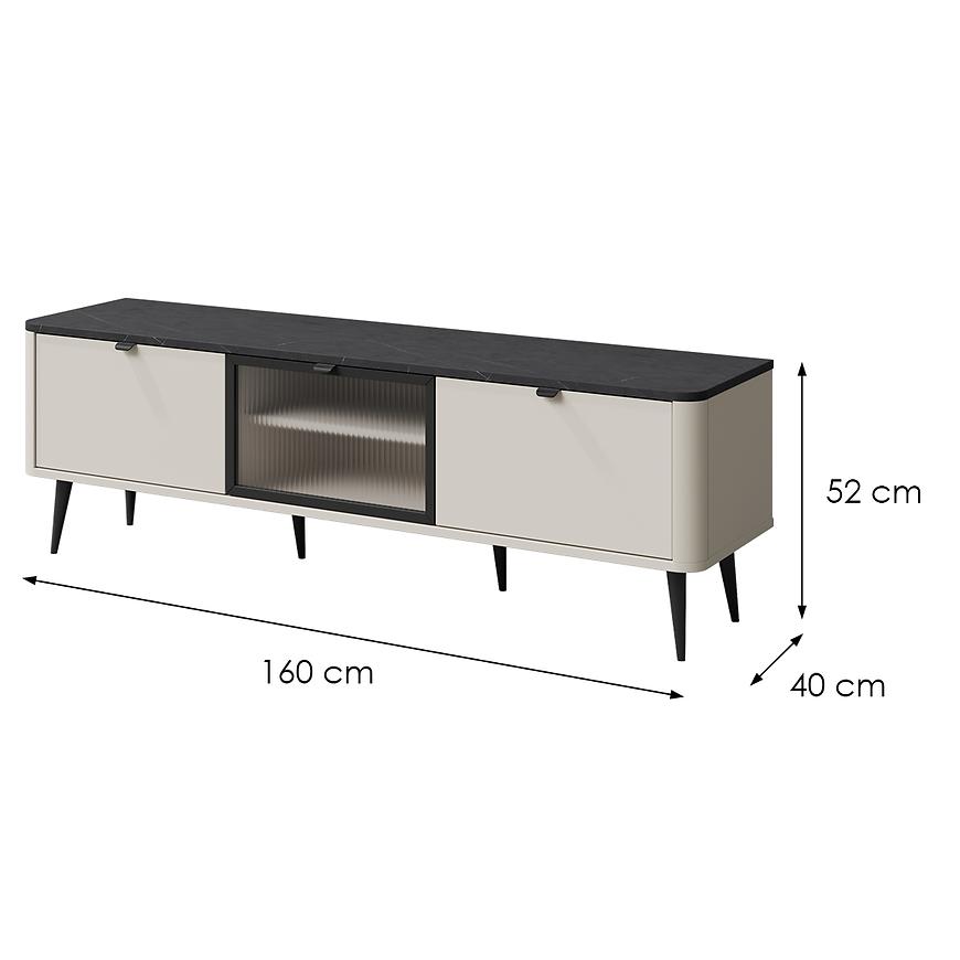 Szafka RTV Marly 12 o szerokości 160 cm w kolorze kashmir/szary kamień to funkcjonalny i stylowy mebel, który doskonale wpisuje się w aktualne trendy wnętrzarskie. Subtelny, jasny odcień kashmir w połączeniu z eleganckim dekorem szarego kamienia tworzy harmonijną całość, idealną do nowoczesnych i minimalistycznych przestrzeni.
