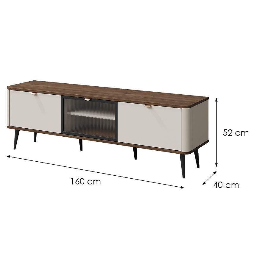 Szafka RTV Marly 12 o szerokości 160 cm w wybarwieniu orzech/kashmir to doskonałe połączenie klasycznego stylu z nowoczesną funkcjonalnością. Ciepły odcień drewna orzechowego nadaje wnętrzu przytulności, a jasny front w kolorze kashmir wprowadza lekkość i subtelność, tworząc wyjątkowo elegancki kontrast.