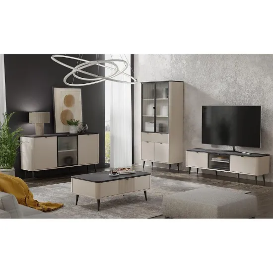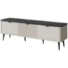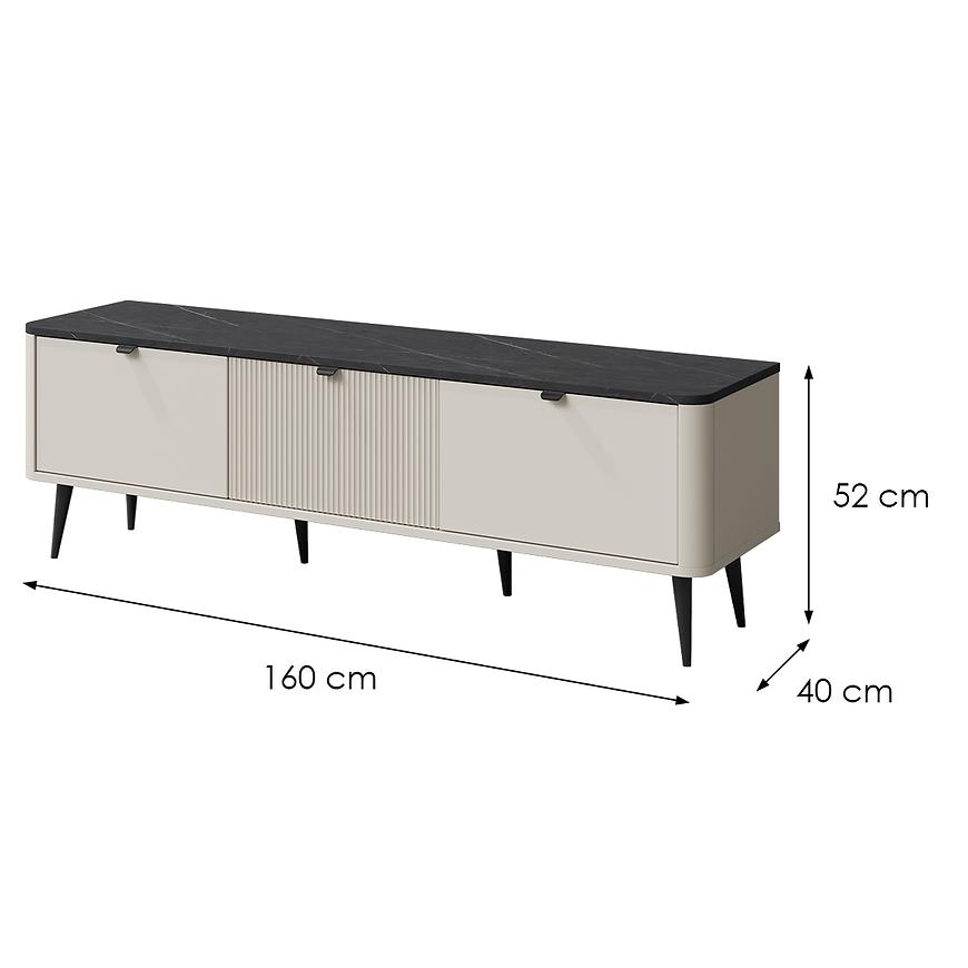 Szafka RTV Marly 13 o szerokości 160 cm w kolorze kashmir/szary kamień to nowoczesny mebel, który łączy subtelne, matowe wykończenie z dekoracyjnym akcentem przypominającym naturalny kamień. Harmonijne zestawienie kolorów nadaje całości elegancki, stonowany wygląd, idealny do nowoczesnych, minimalistycznych lub loftowych wnętrz.