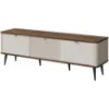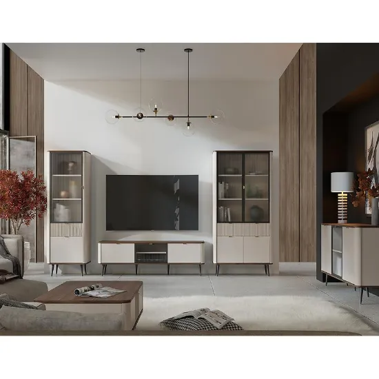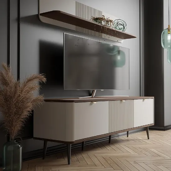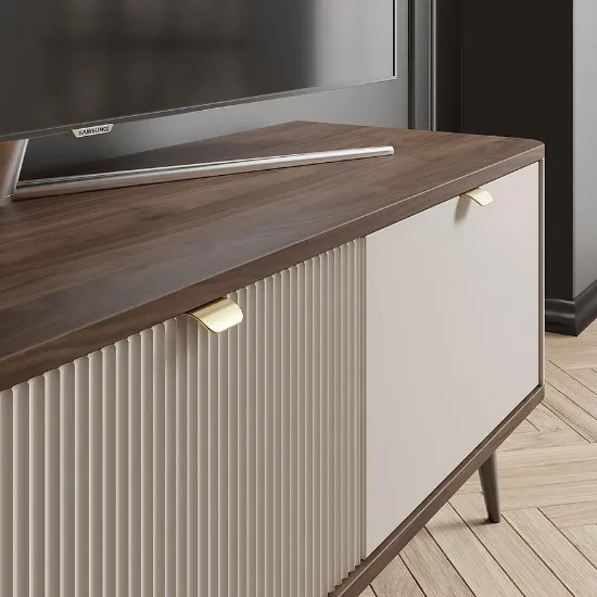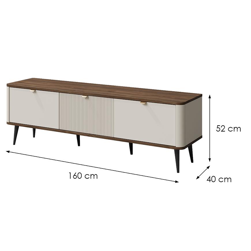 Szafka RTV Marly 13 o szerokości 160 cm w kolorze orzech/kashmir to eleganckie i funkcjonalne rozwiązanie do nowoczesnych wnętrz. Połączenie ciepłego odcienia orzecha z subtelnym kolorem kashmir tworzy harmonijny i ponadczasowy duet, który wzbogaci każdą aranżację salonu.