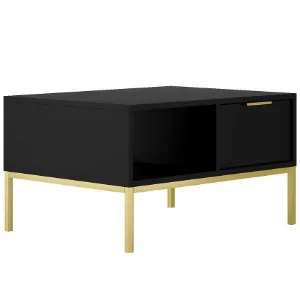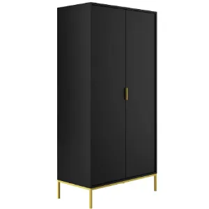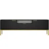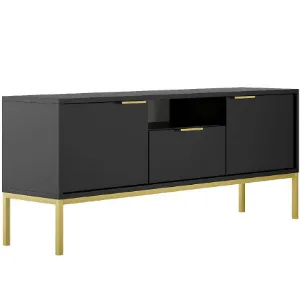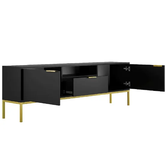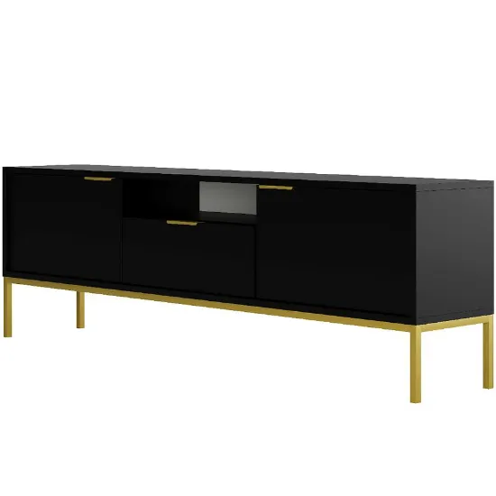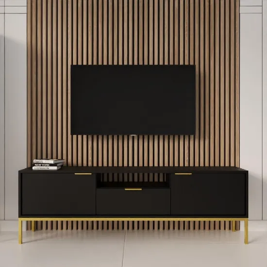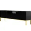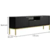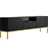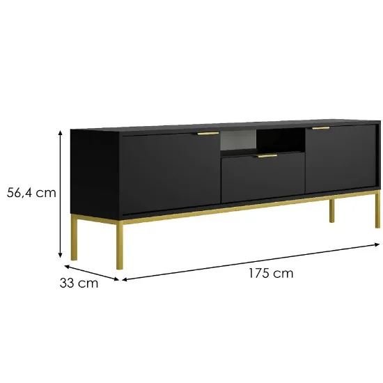 Szafka RTV w kolorze Czarny/Złoty z kolekcji Austin to stylowe i funkcjonalne rozwiązanie do nowoczesnych wnętrz. Jej minimalistyczny design doskonale komponuje się z różnymi aranżacjami, wprowadzając do salonu elegancję i porządek. Konstrukcja wykonana z laminowanej płyty wiórowej gwarantuje trwałość i odporność na codzienne użytkowanie, a matowe wykończenie nadaje całości subtelnej elegancji.