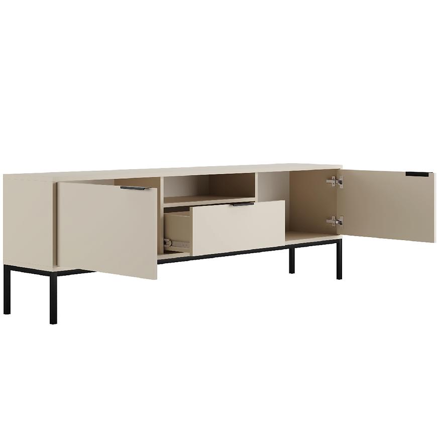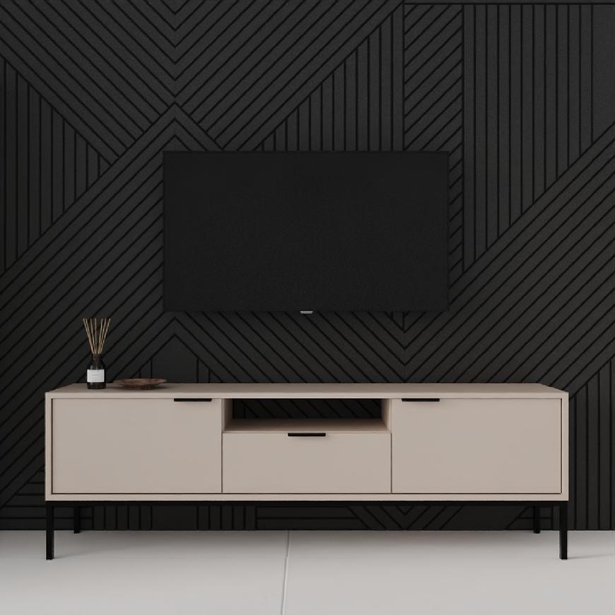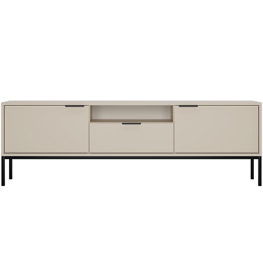 Szafka RTV w kolorze Kaszmir/Czarny z kolekcji Austin to stylowe i funkcjonalne rozwiązanie do nowoczesnych wnętrz. Jej minimalistyczny design doskonale komponuje się z różnymi aranżacjami, wprowadzając do salonu elegancję i porządek. Konstrukcja wykonana z laminowanej płyty wiórowej gwarantuje trwałość i odporność na codzienne użytkowanie, a matowe wykończenie nadaje całości subtelnej elegancji.