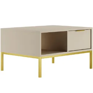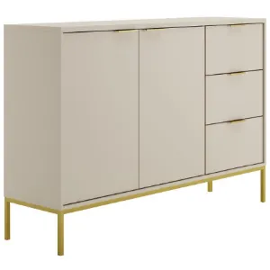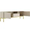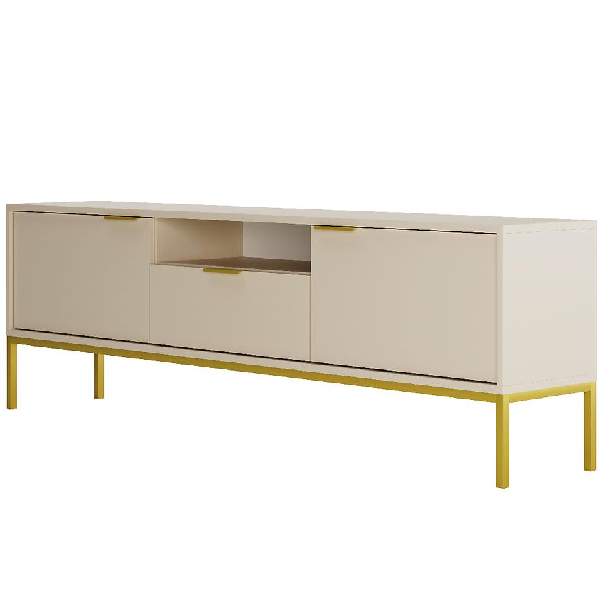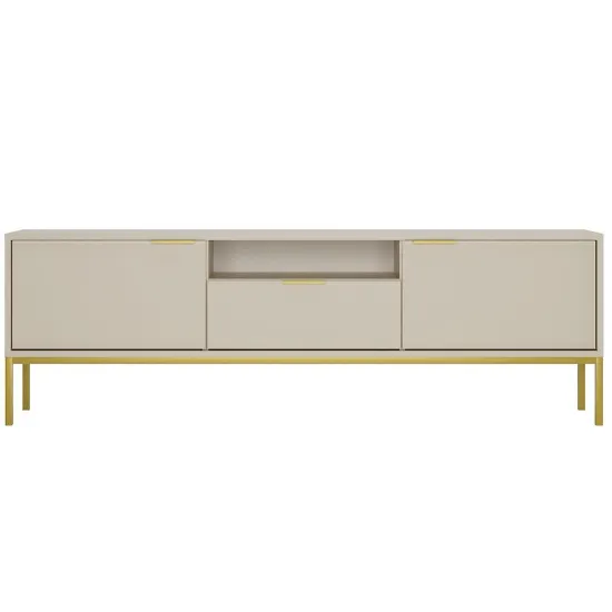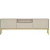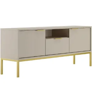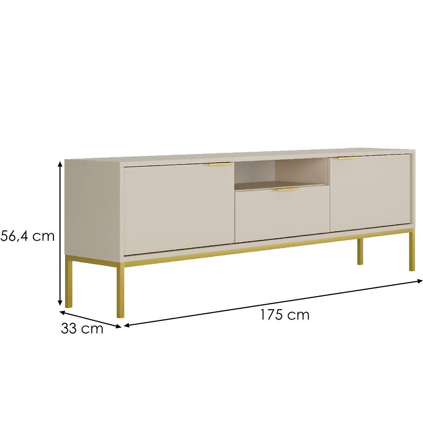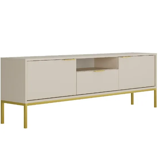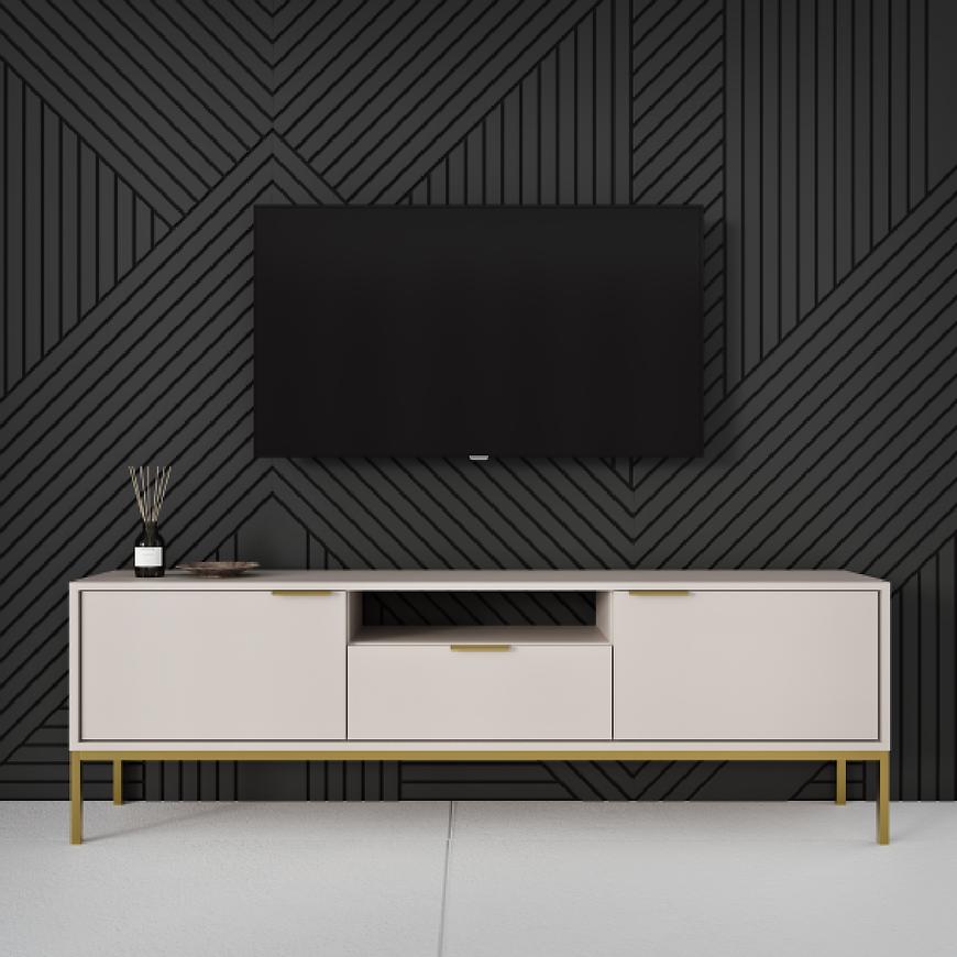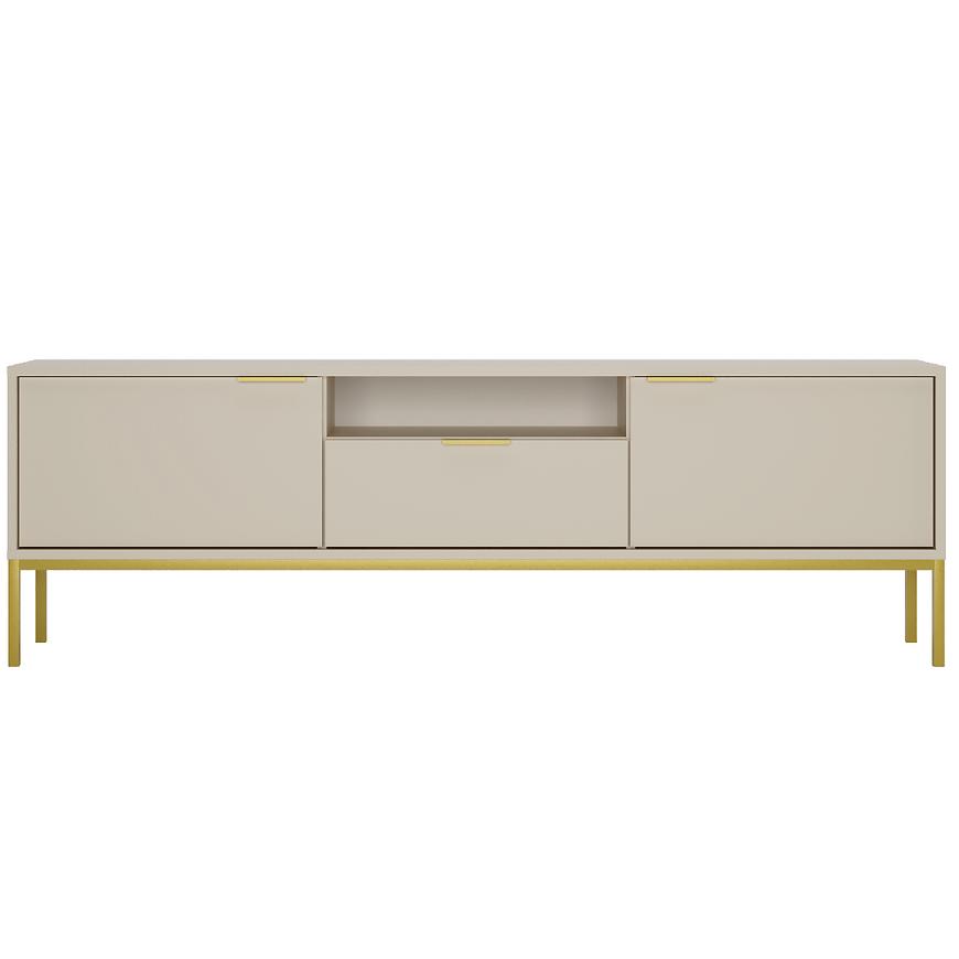 Szafka RTV w kolorze Kaszmir/złoty z kolekcji Austin to stylowe i funkcjonalne rozwiązanie do nowoczesnych wnętrz. Jej minimalistyczny design doskonale komponuje się z różnymi aranżacjami, wprowadzając do salonu elegancję i porządek. Konstrukcja wykonana z laminowanej płyty wiórowej gwarantuje trwałość i odporność na codzienne użytkowanie, a matowe wykończenie nadaje całości subtelnej elegancji.