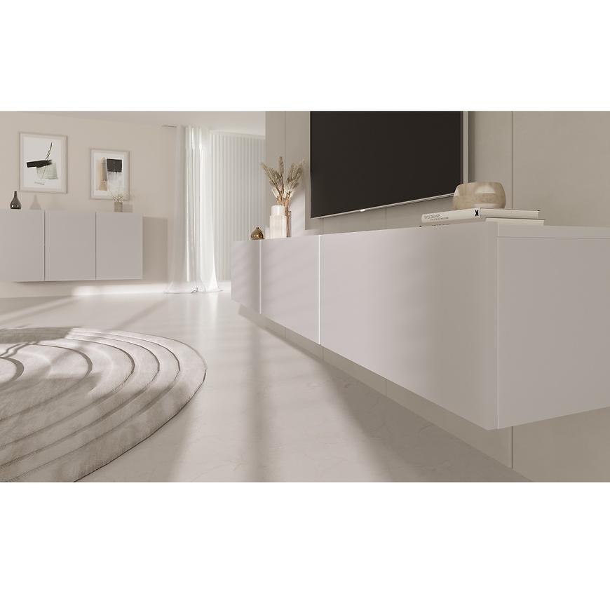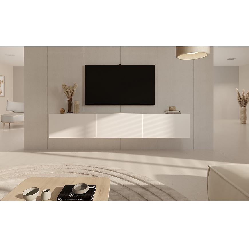Szafka RTV 180 Wisząca Dallas Biały to nowoczesny i stylowy mebel idealny do salonu. Wykonana z wysokiej jakości matowej płyty wiórowej laminowanej w eleganckim białym kolorze, doskonale wpisuje się w jasne i minimalistyczne wnętrza. Mebel ma wymiary: wysokość 29,6 cm, szerokość 180 cm oraz głębokość 35 cm, co zapewnia dużo miejsca na sprzęt RTV i dekoracje. Posiada trzydrzwiową konstrukcję bez szuflad, waży 26,2 kg i wymaga samodzielnego montażu. Wiszący design nadaje lekkości pomieszczeniu, podkreślając nowoczesny charakter Twojego salonu.