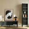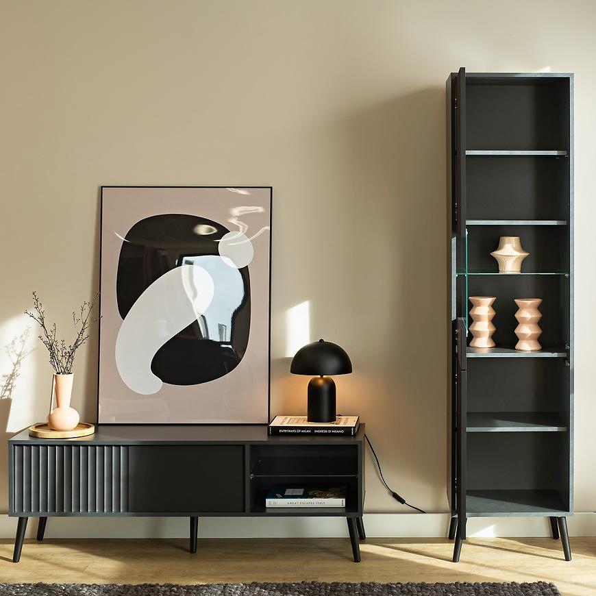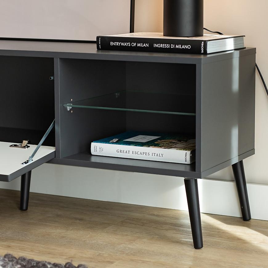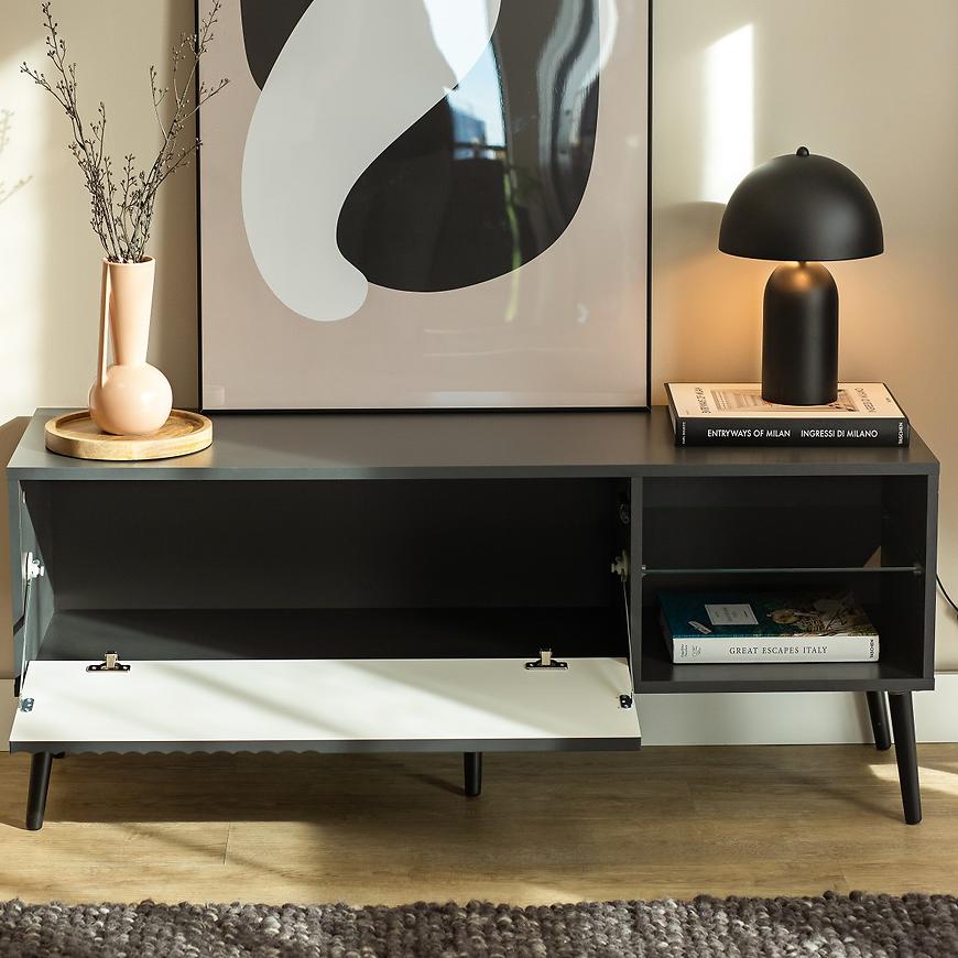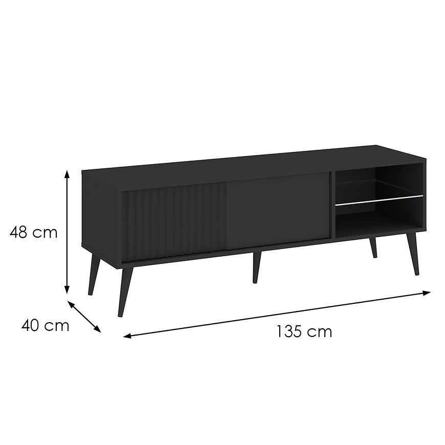 Mebel o szerokości 135 cm i wysokości 48 cm zapewnia wystarczającą przestrzeń zarówno na sprzęt RTV, jak i dekoracje. Jednodrzwiowa konstrukcja pozwala na wygodne przechowywanie przedmiotów poza zasięgiem wzroku, a dodatkowe półki ułatwiają organizację kabli i akcesoriów.