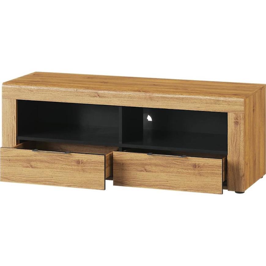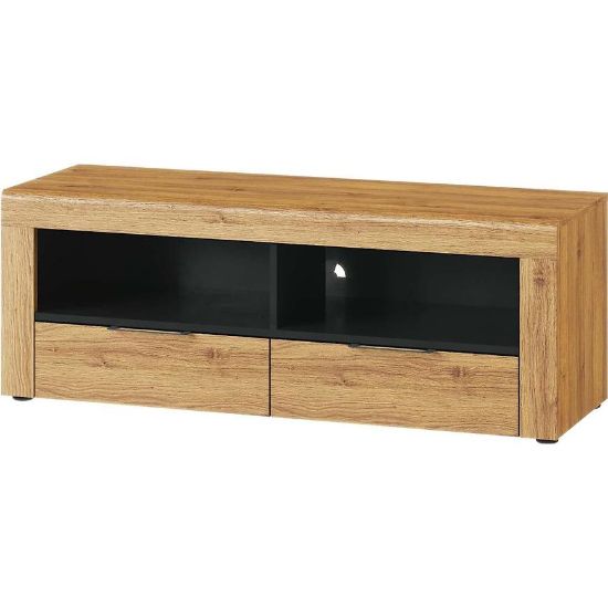 Konstrukcja tej szafki została starannie zaprojektowana, by zapewnić nie tylko estetykę, ale także funkcjonalność. Dzięki swojej przemyślanej budowie oferuje odpowiednią ilość miejsca na przechowywanie różnorodnych urządzeń elektronicznych oraz dodatkowych akcesoriów. Dwa szuflady i półki idealnie pomieszczą kable, piloty, płyty DVD czy też inne drobiazgi, które chcesz zachować w zasięgu ręki, ale jednocześnie uporządkowane.
