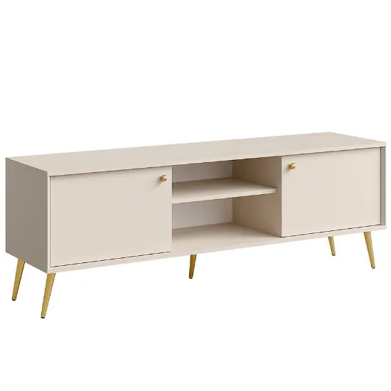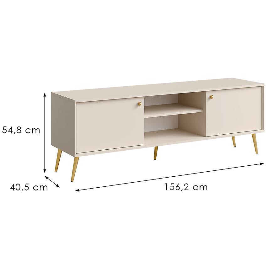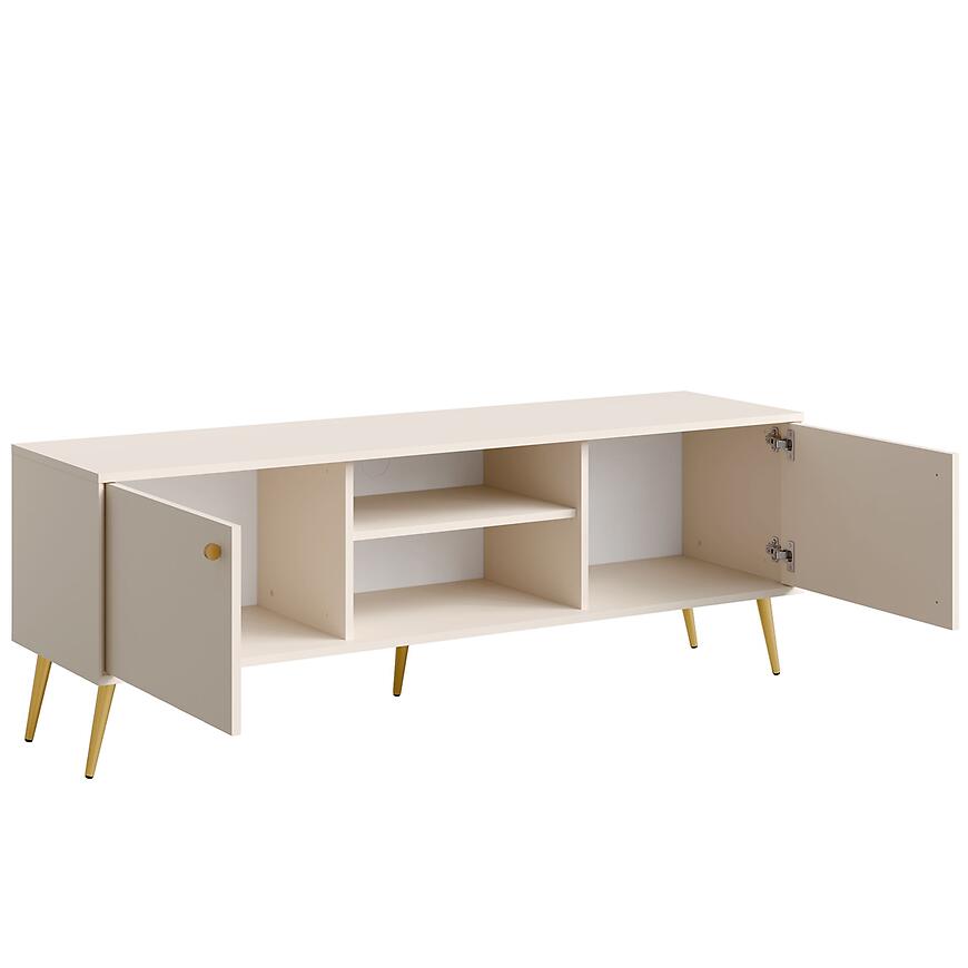 Beż piaskowy w połączeniu ze złotymi nóżkami i uchwytami tworzy spójną, elegancką kompozycję. To doskonałe rozwiązanie do wnętrz w stylu nowoczesnym, glamour lub soft loft. Szafka RTV ROSE 08 nie posiada oświetlenia, co pozwala zachować minimalistyczny charakter i dopasować dodatkowe źródła światła według własnych preferencji.