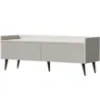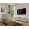 Funkcjonalność szafki podkreślają dwie przestronne szafki, które zapewniają dyskretną przestrzeń do przechowywania kabli, płyt DVD, gier czy książek. Dzięki temu wnętrze pozostaje uporządkowane, a wszystkie niezbędne przedmioty można łatwo schować, dbając o estetykę i harmonię przestrzeni. Matowe fronty, które nie odbijają światła, są praktyczne i łatwe do utrzymania w czystości, co czyni szafkę Ademo szczególnie praktycznym wyborem do codziennego użytku.