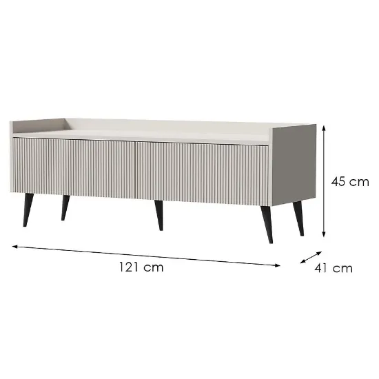 Szafka RTV Ademo Kaszmir to elegancki i funkcjonalny mebel, który doskonale wpasuje się w nowoczesne wnętrza, stanowiąc stylową oprawę dla strefy multimedialnej. Wyjątkowe beżowe wybarwienie w modnym odcieniu kaszmiru nadaje jej subtelnej elegancji, a matowe wykończenie frontów i korpusu podkreśla współczesny charakter. Wykonana z wytrzymałej płyty wiórowej laminowanej zapewnia trwałość oraz odporność na codzienne użytkowanie. Przy szerokości 121 cm, wysokości 45 cm i głębokości 41 cm szafka Ademo oferuje sporo miejsca na sprzęt RTV oraz różne akcesoria, zachowując przy tym zgrabną, kompaktową formę, która nie przytłacza przestrzeni.