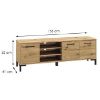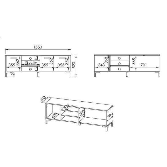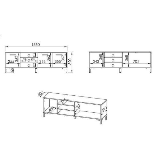 Trzydrzwiowa szafka oferuje przestronne półki, które umożliwiają uporządkowanie sprzętu RTV i akcesoriów. Blat szafki bez problemu pomieści telewizor, a wnętrze szafek pozwala ukryć kable i urządzenia, utrzymując porządek w salonie. Laminowana płyta wiórowa, z której wykonano mebel, zapewnia trwałość i odporność na codzienne użytkowanie.