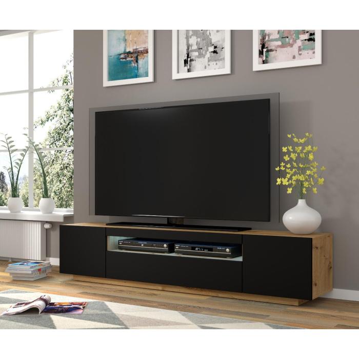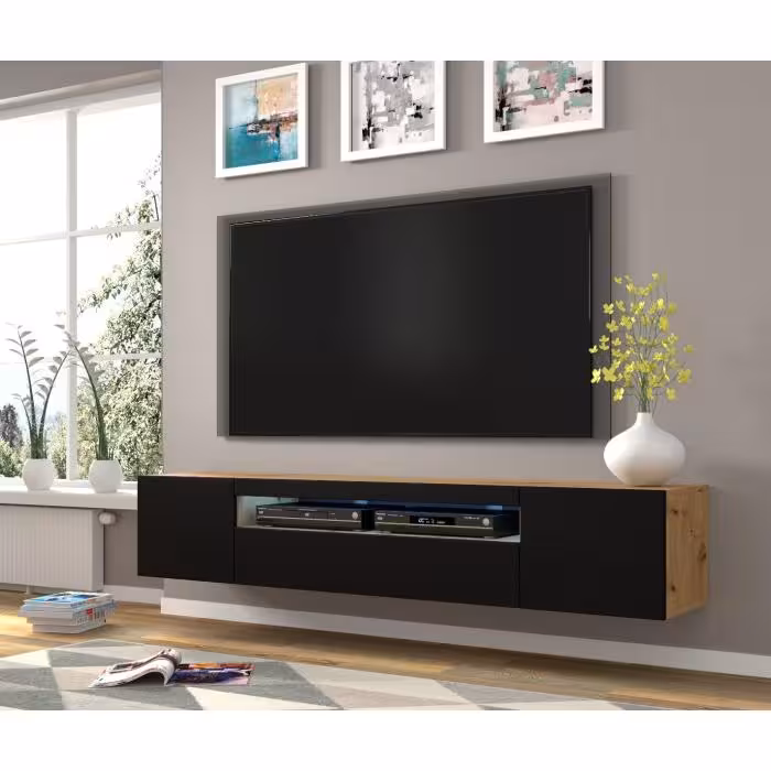 Szafka rtv jest uniwersalna , gdyż może być stojąca wysokość 42 cm lub wisząca przymocowana do ściany wysokość 36 cm, możliwość wyboru przy montażu. Posiada dwie zamykane półki otwierane na boki, jedną zamykaną półką otwieraną do dołu, a także otwór na kable.