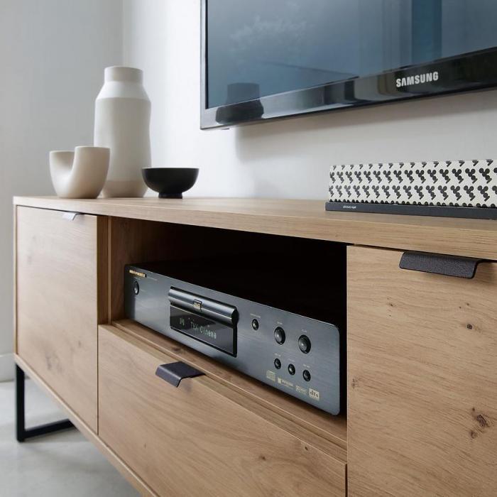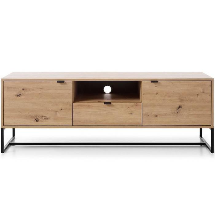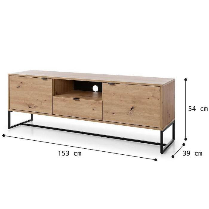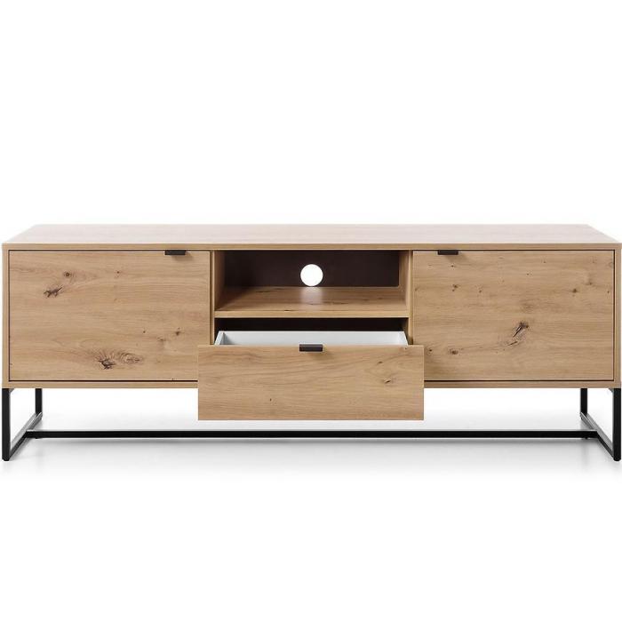 Szafka RTV posiada dwie szafki z uchylnymi drzwiami, jedną półkę oraz jedną wysuwaną szufladę. Komoda może być świetnym uzupełnieniem aranżacji w salonie.