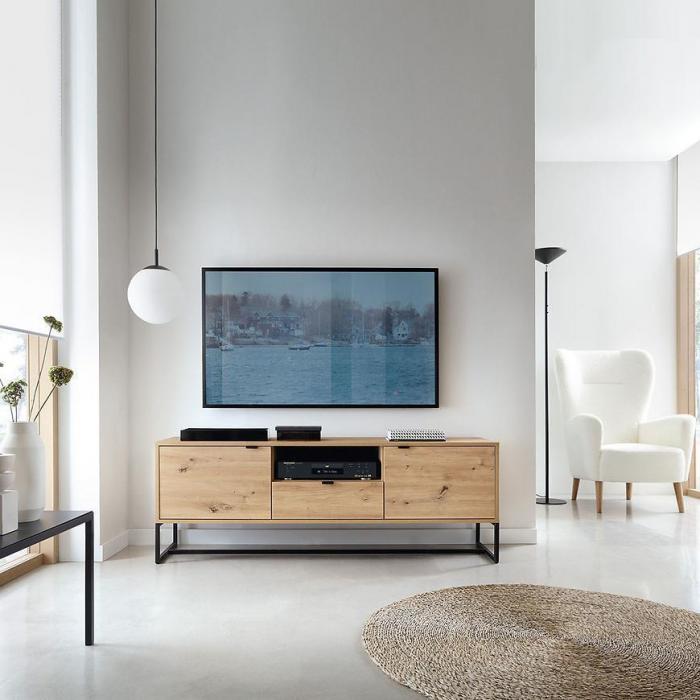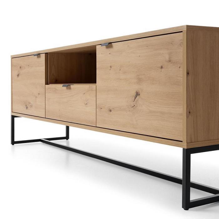 Kolekcja Abmer to meble utrzymane w stylu loftowym, modernistycznym, które świetnie sprawdzą się w nowoczesnych wnętrzach. Jasny, ciepły odcień drewna w połączeniu z czernią świetnie współgrają – drewno ociepla pomieszczenie i całą aranżację, czerń natomiast oddaje jego minimalistyczny charakter. Metalowe płozy dodatkowo stabilizują mebel. Dzięki temu, że konstrukcja jest umieszczona w ten sposób umożliwia nam odkurzenie czy umycie podłogi pod meblami.