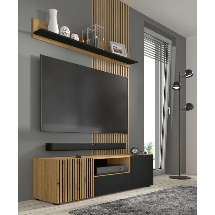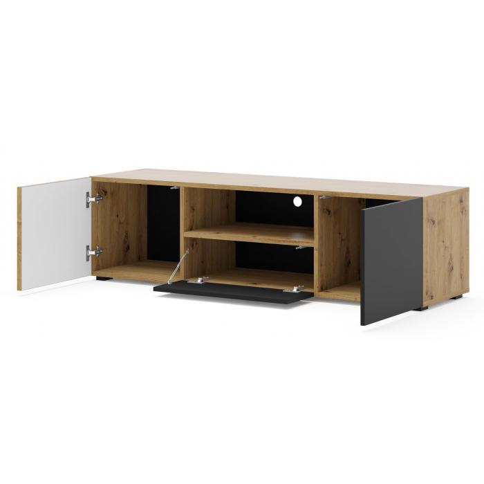 Szafka rtv została wykonana korpus i czarne fronty z płyty laminowanej 16 mm, obrzeża wykończone ABS 0,6 mm, front lamele to płyta MDF 22 mm. Szafka posiada trzy zamknięte szafki oraz jedna otwartą półkę. Mebel, który z pewności pomieści sprzęt RTV, konsole, sprzęt grający lub piloty, ale także inne nasze drobiazgi, akcesoria, czy książki.
