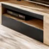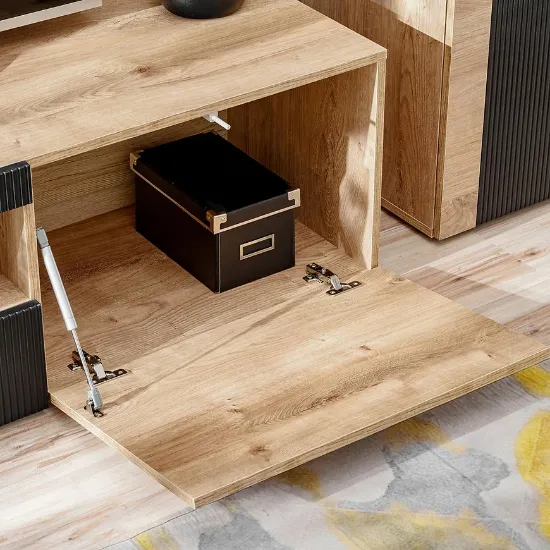 Wyjątkowe zestawienie kolorystyczne Dąb Ribbeck/Czarny wprowadza do wnętrza harmonię natury i nowoczesności. Jasne usłojenie drewna ociepla przestrzeń, a matowa czerń nadaje jej głębi i elegancji. To połączenie doskonale komponuje się z oświetleniem LED, które można dodać do niektórych elementów zestawu, tworząc wyjątkowy nastrój w salonie.