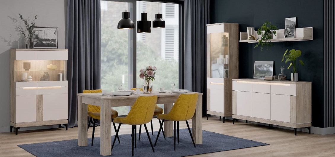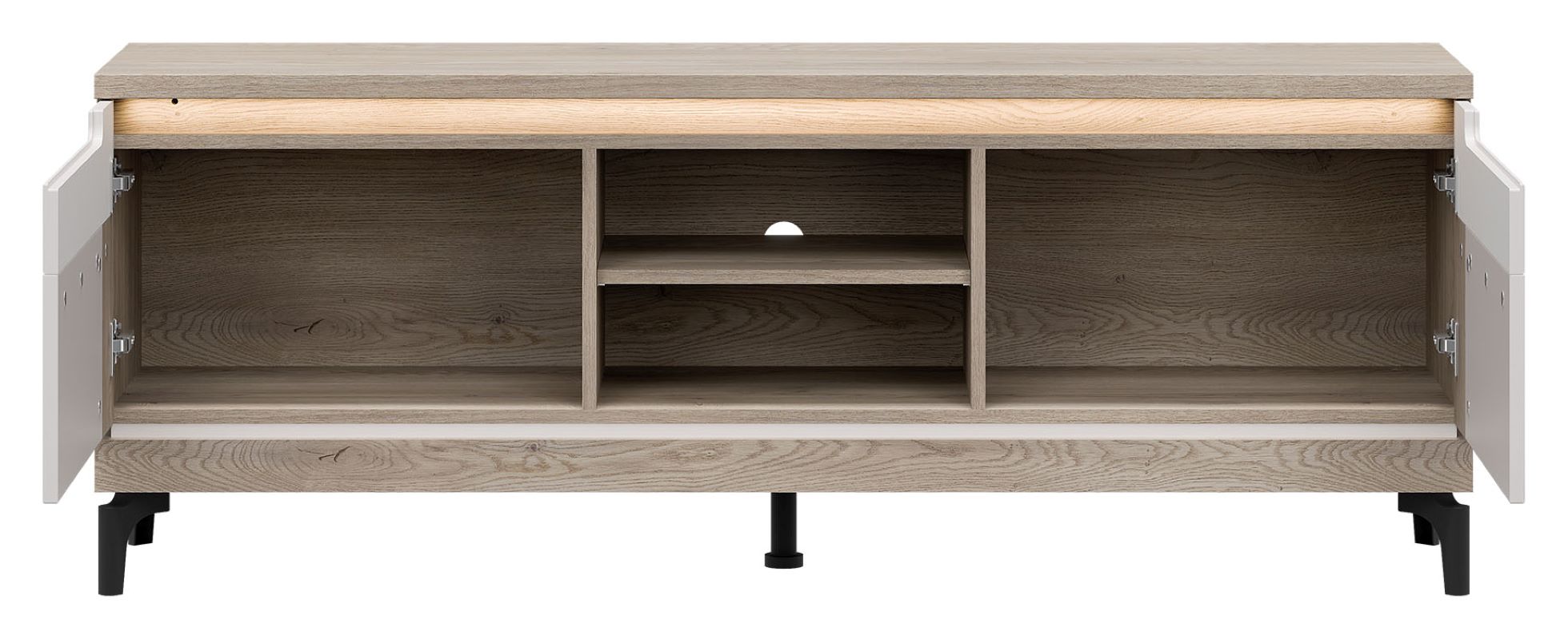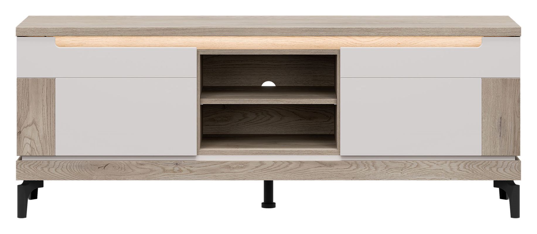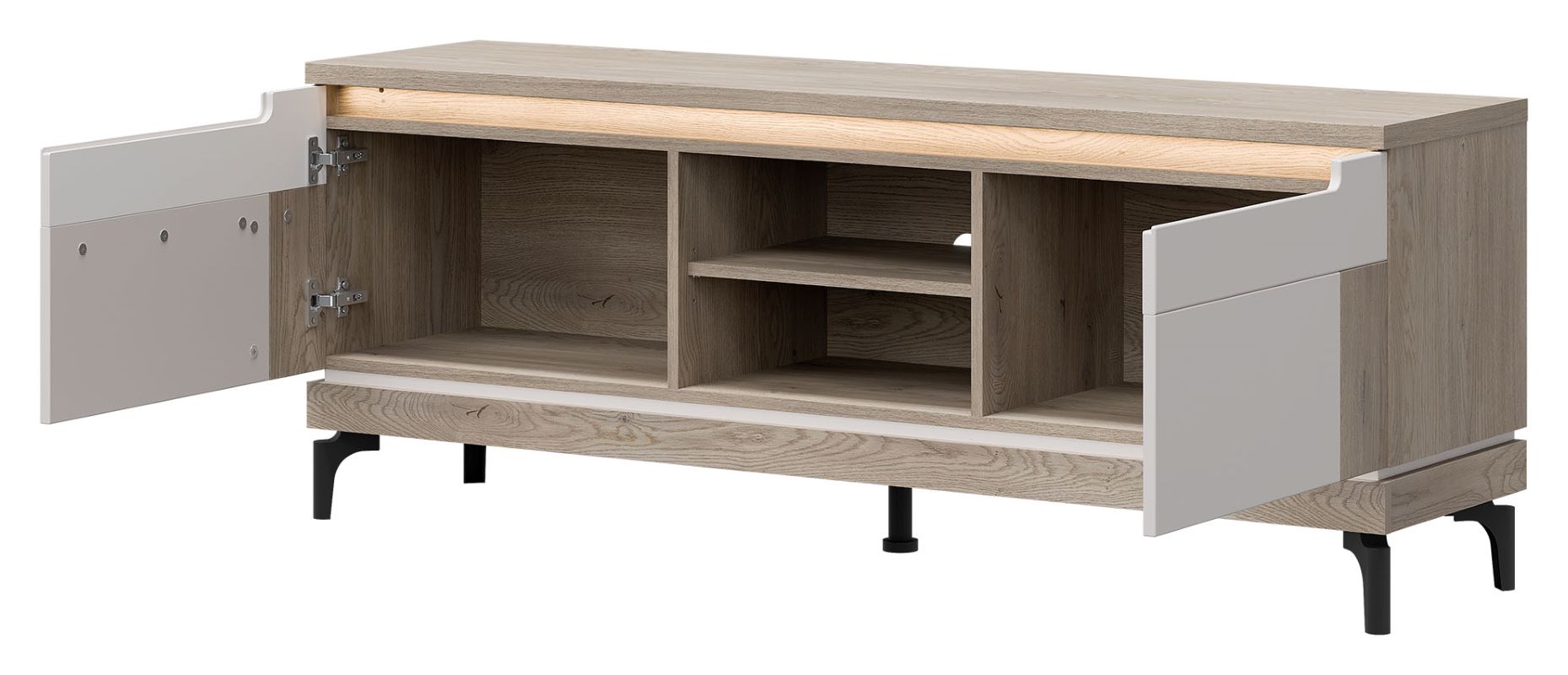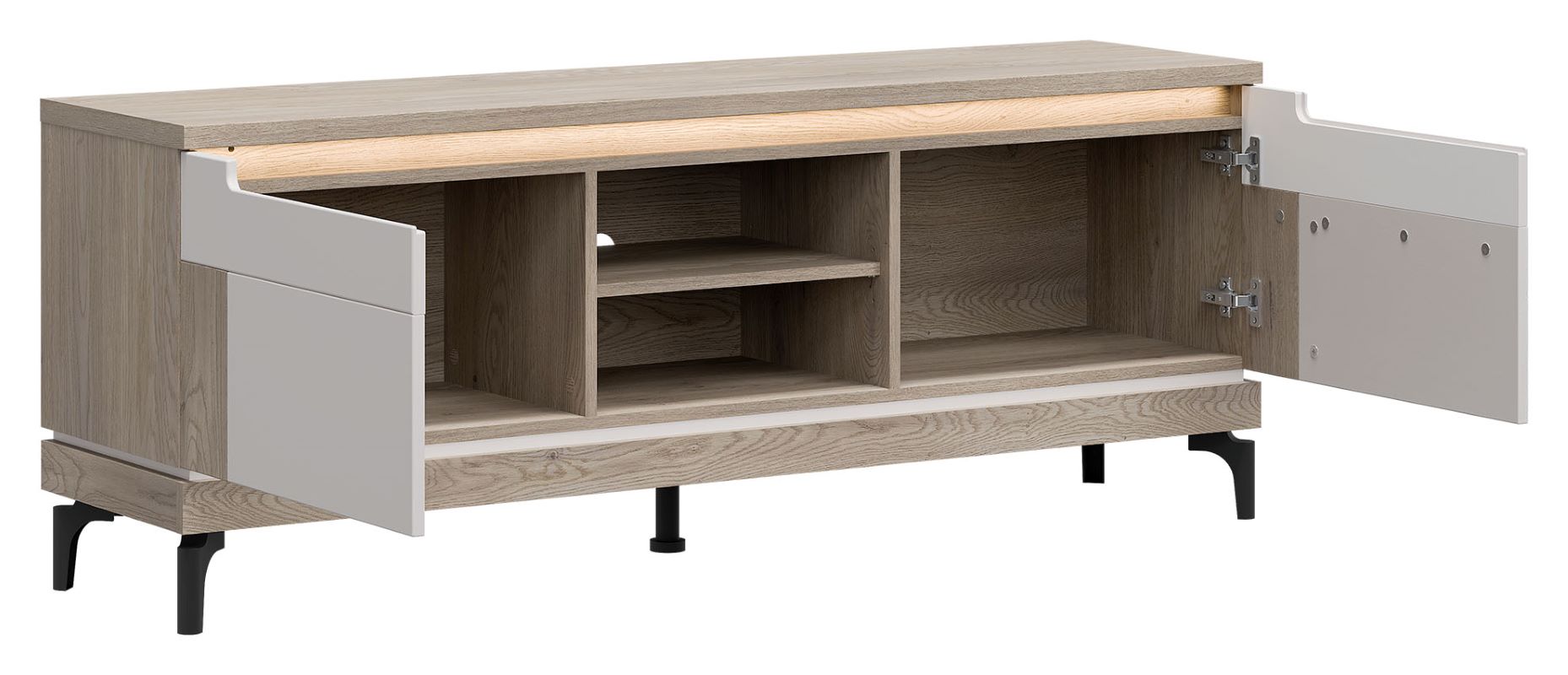 Szafka RTV Aston AN01 dwudrzwiowa z jedną półką, wykonany z płyty wiórowej laminowanej w kolorze dąb cremona\kaszmir. Uchwyt frezowany. Szafka na nóżkach o wysokości 12 cm. Istnieje możliwośc instalacji oświetlenia LED - opcja dodatkowo płatna.