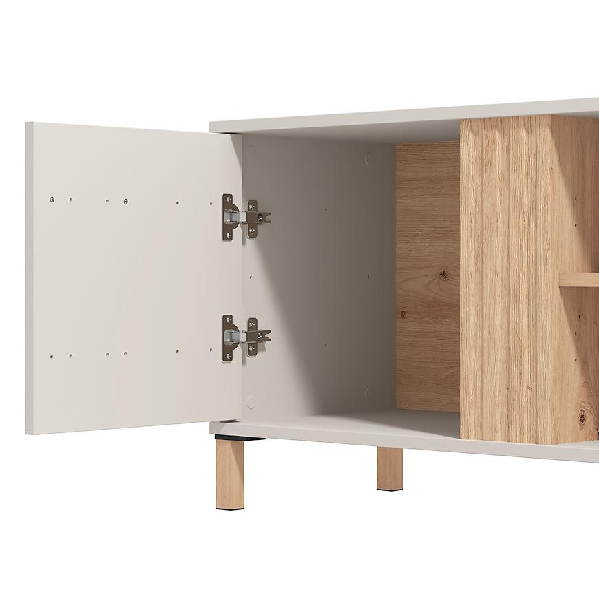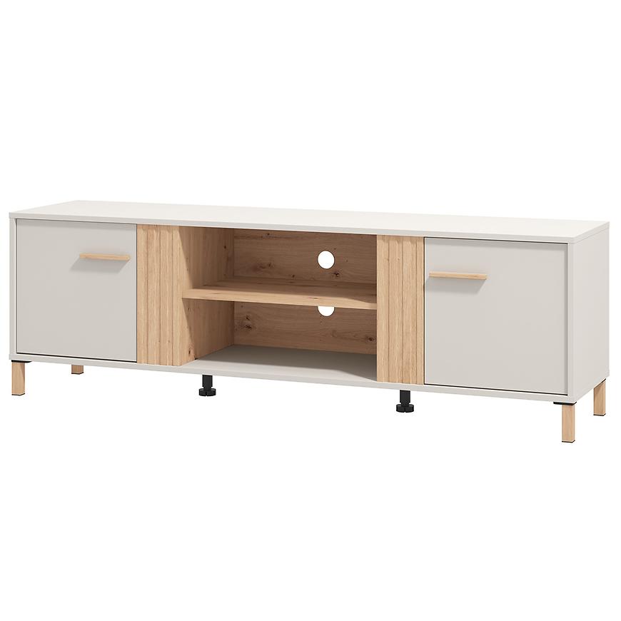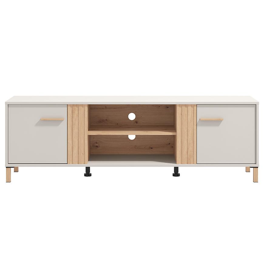 Szafka RTV pod telewizor z dwoma frontami i otwartymi półkami to doskonałe miejsce na sprzęt multimedialny i akcesoria.