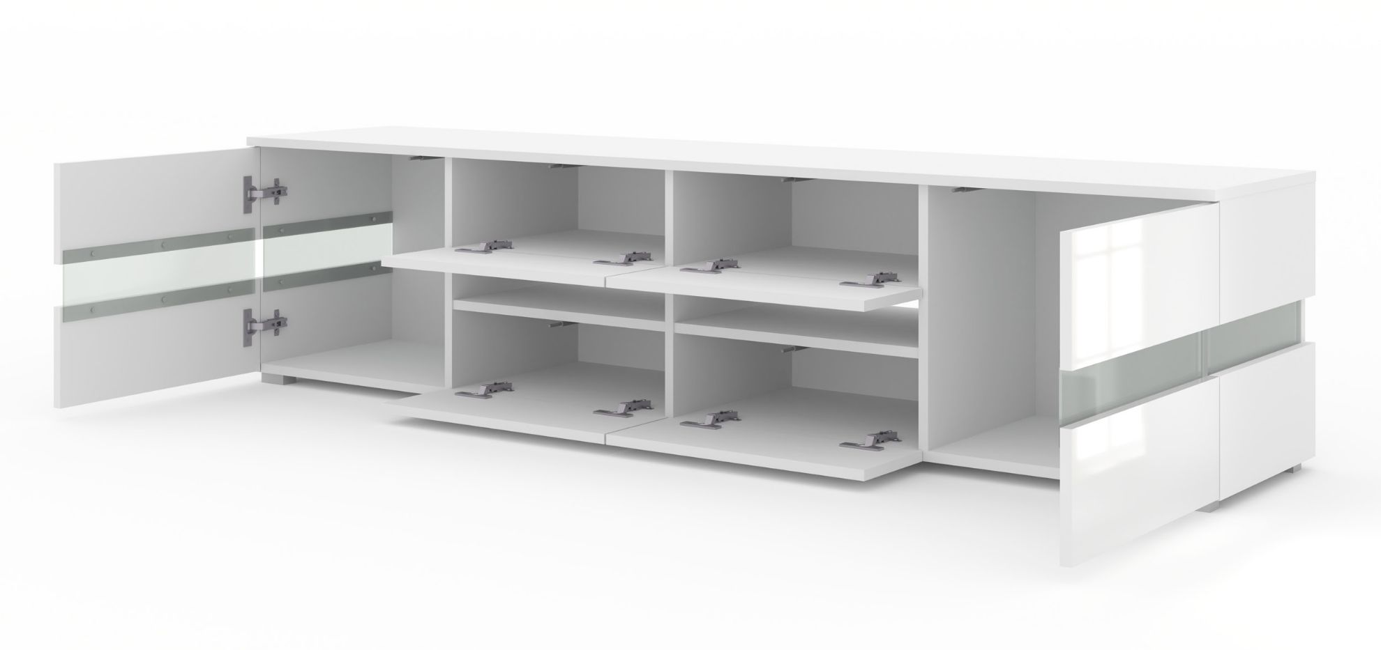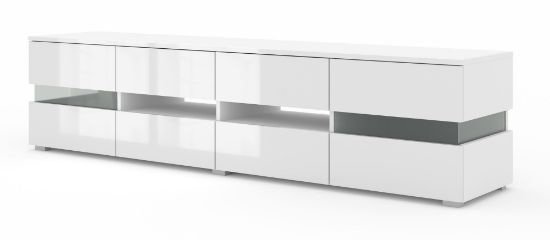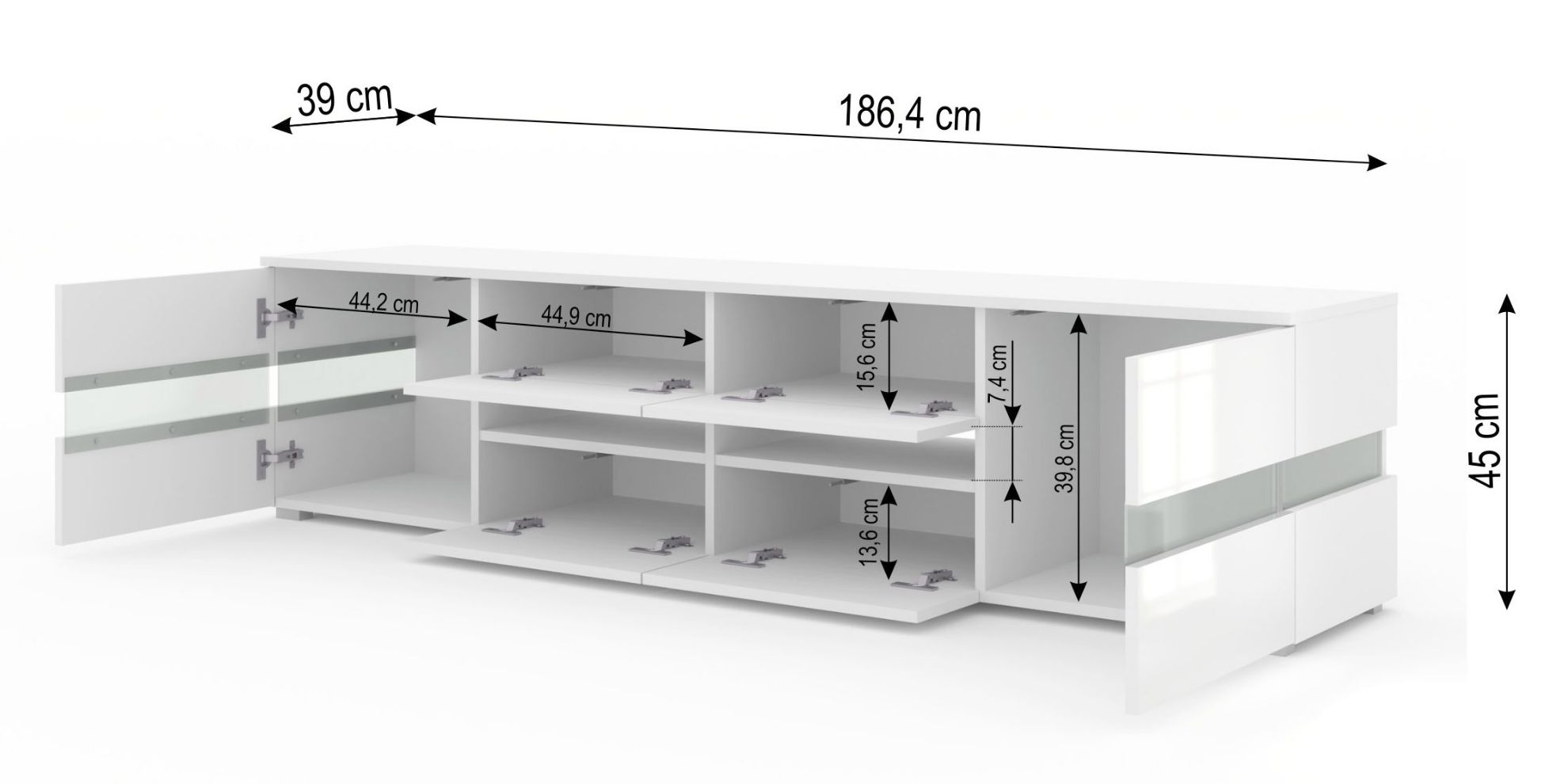Białe fronty w połysku doskonale współgrają z białym matem korpusu, tworząc spójną całość. Szafka RTV Bronek 186 to nie tylko praktyczny mebel, ale również designerski element, który nadaje salonowi nowoczesny i stylowy wygląd. To idealne rozwiązanie dla tych, którzy cenią funkcjonalność, estetykę i wysoką jakość wykonania w jednym.