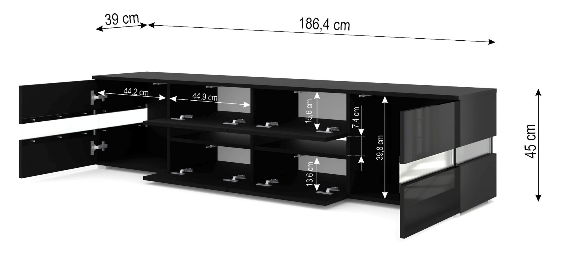 Czarne fronty w połysku doskonale współgrają z czarnym matem korpusu, tworząc spójną całość. Szafka RTV Bronek 186 to nie tylko praktyczny mebel, ale również designerski element, który nadaje salonowi nowoczesny i stylowy wygląd. To idealne rozwiązanie dla tych, którzy cenią funkcjonalność, estetykę i wysoką jakość wykonania w jednym.