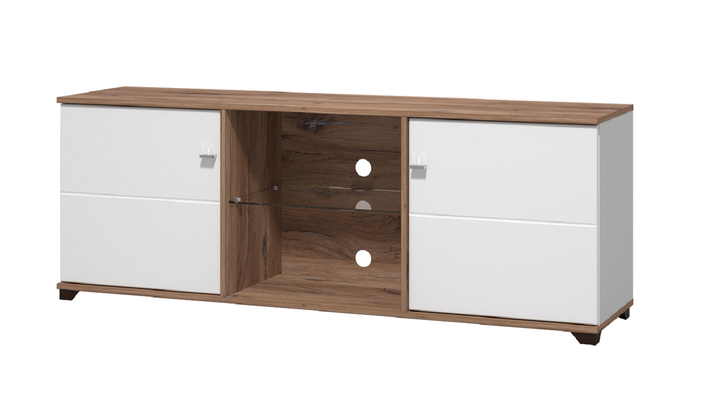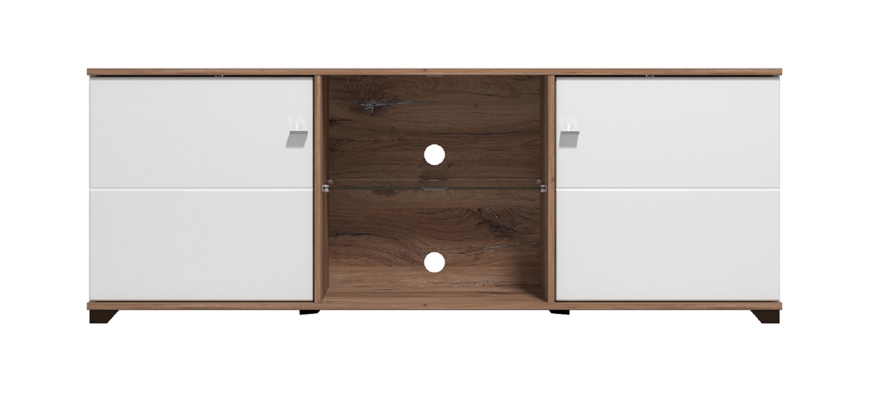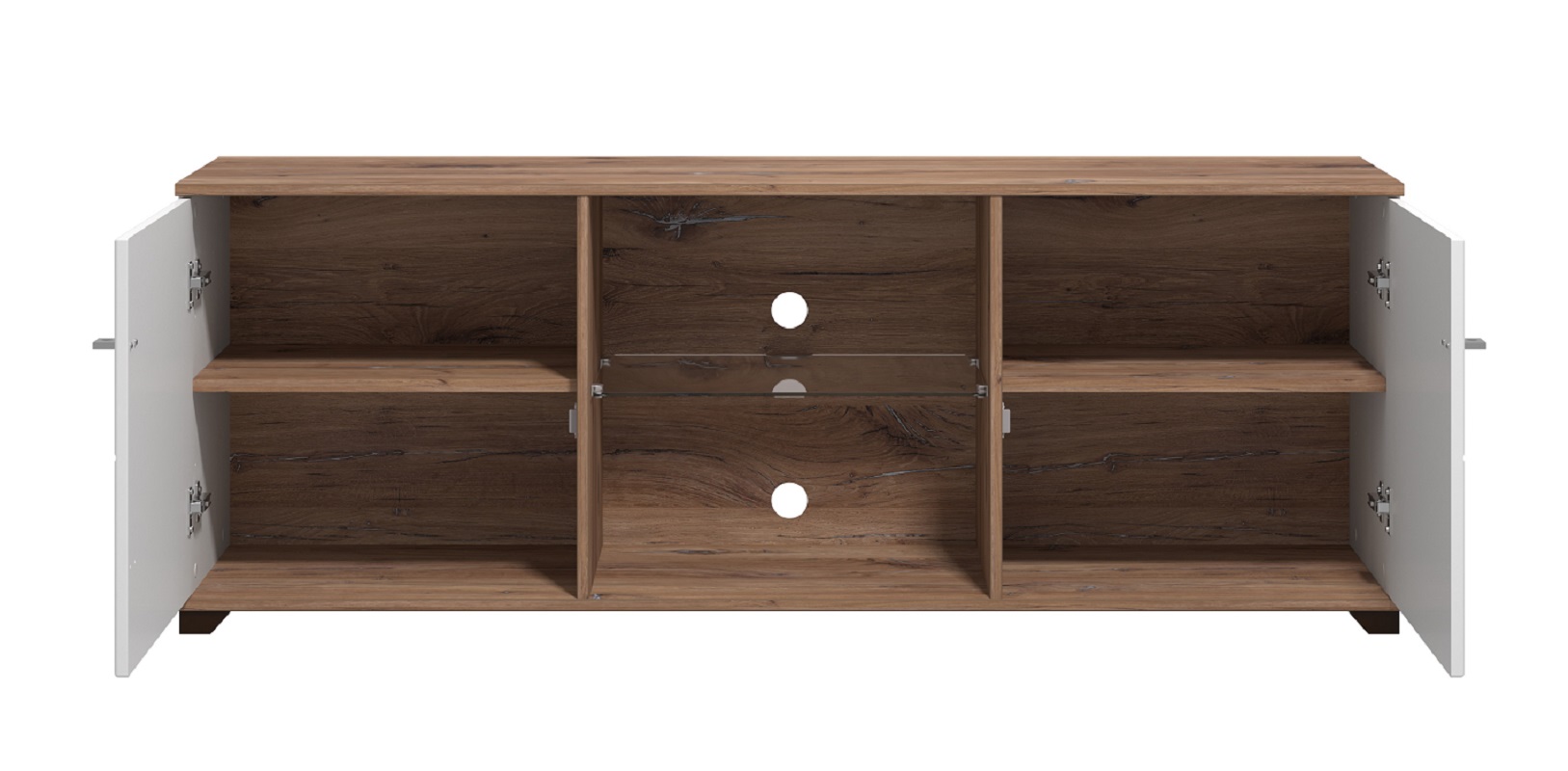 Szafka RTV jest dwudrzwiowa, co pozwala na wygodne umieszczenie różnorodnych urządzeń elektronicznych. Wnętrze szafki posiada dwie półki wykonane z trwałej płyty meblowej, które zapewniają solidne podparcie dla sprzętu. Jedna z półek została wykonana ze szkła, co nadaje dodatkowego efektu wizualnego i pozwala na eksponowanie cennych przedmiotów.