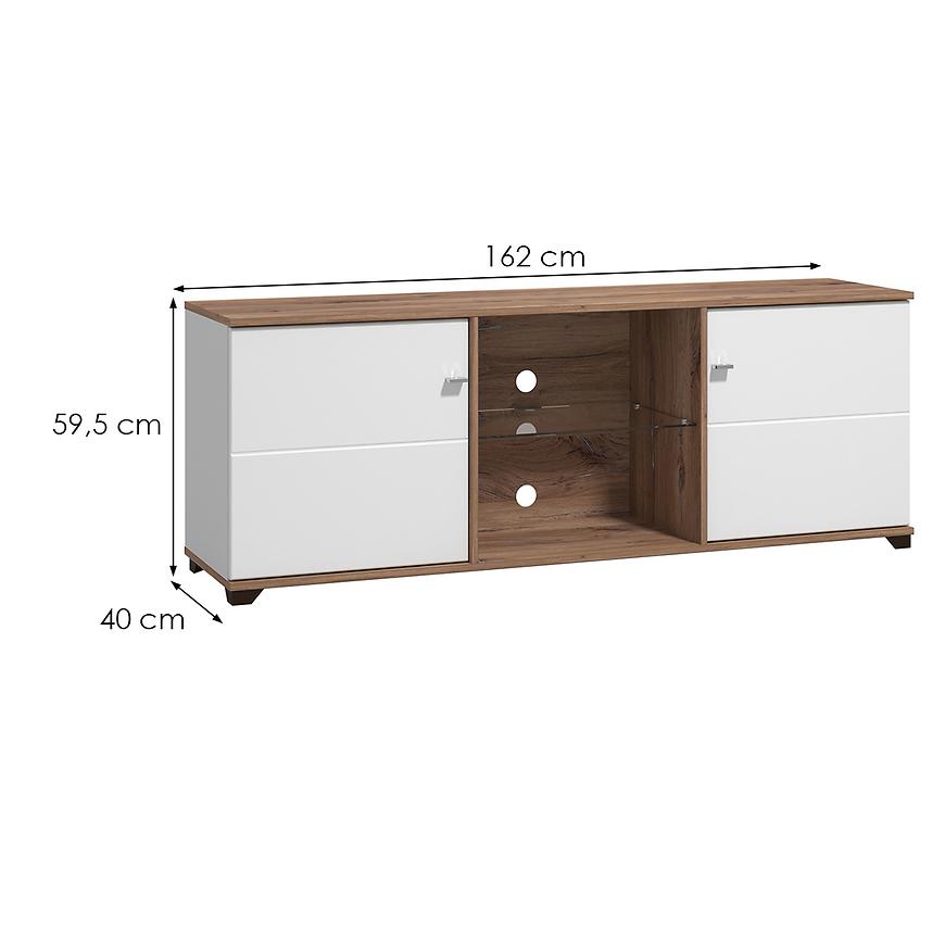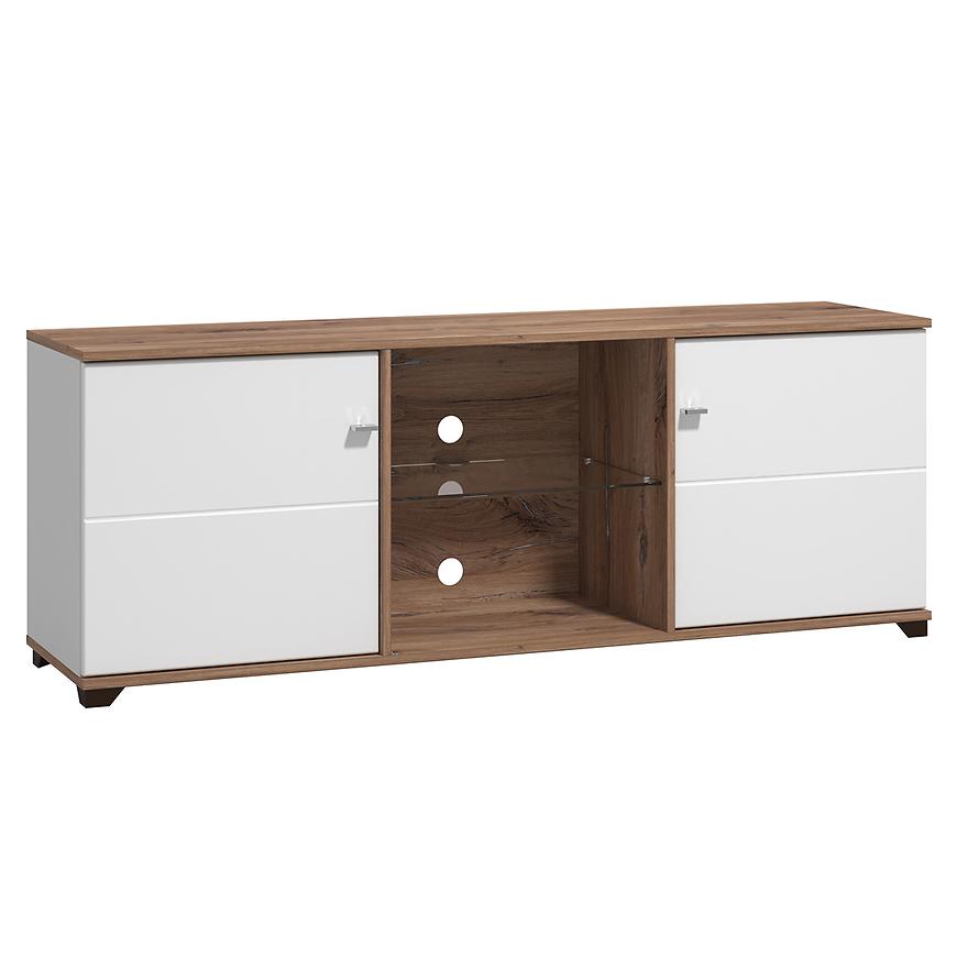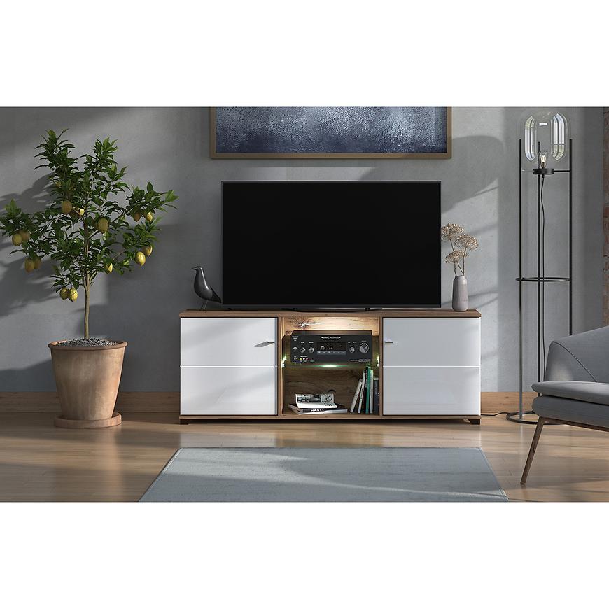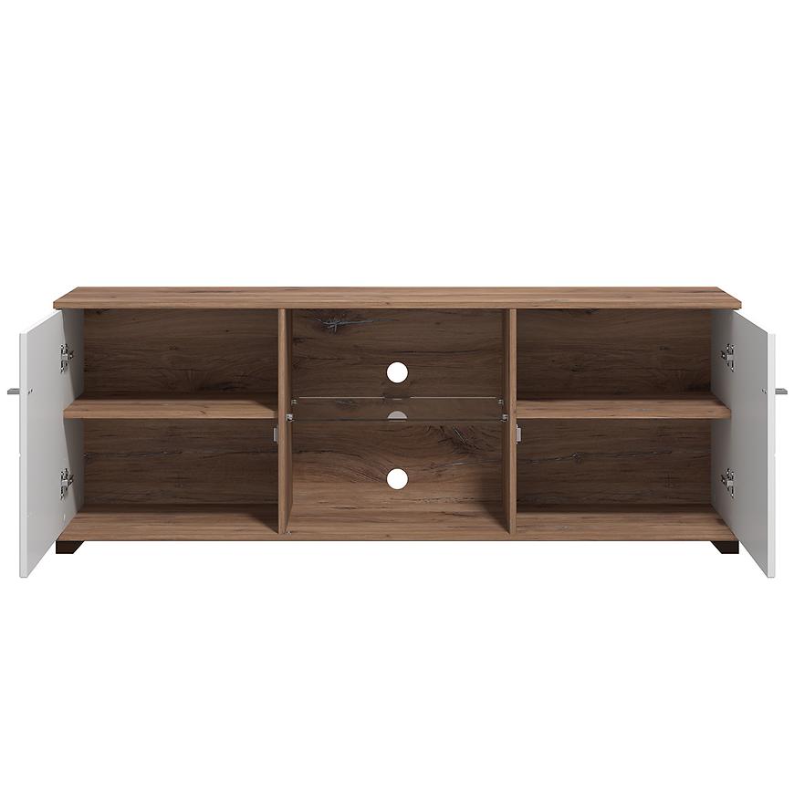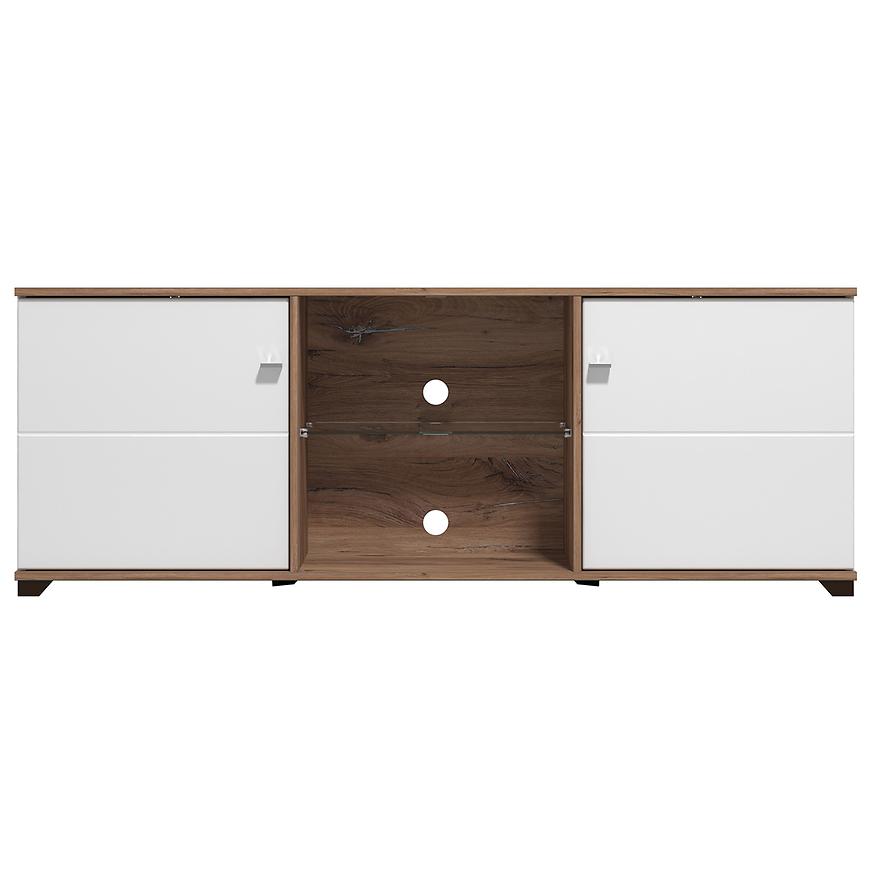Szafka wykonana została z wysokiej jakości laminowanej płyty wiórowej, co gwarantuje trwałość i odporność na codzienne użytkowanie. Dwudrzwiowa konstrukcja pozwala na wygodne przechowywanie sprzętu RTV, akcesoriów multimedialnych lub innych drobiazgów, zapewniając porządek i funkcjonalność.