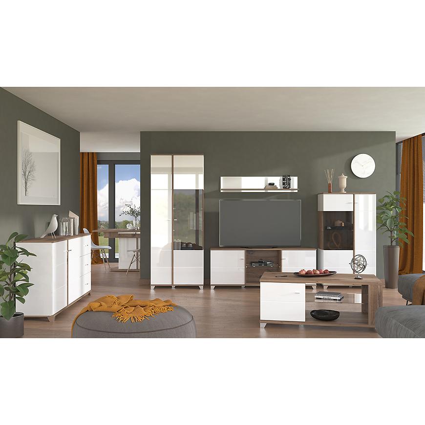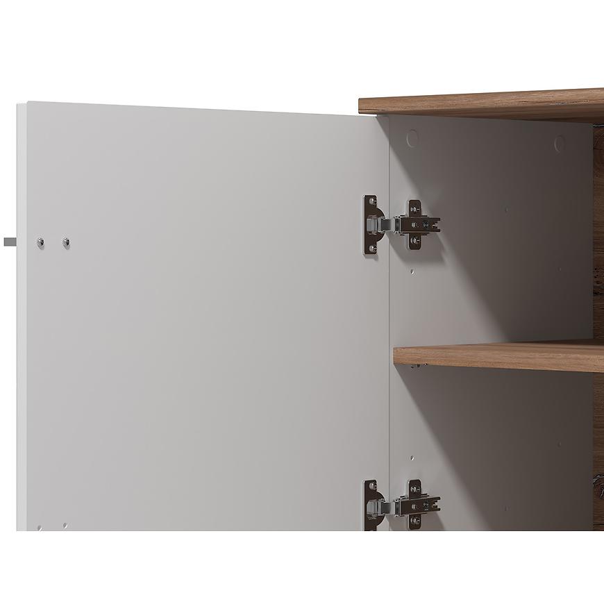 Fronty w kolorze białym o wysokim połysku dodają lekkości i nowoczesnego blasku, podczas gdy korpus w odcieniu dąb flagstaf o matowym wykończeniu zapewnia ciepły, naturalny akcent. To kontrastowe zestawienie tworzy atrakcyjny wizualnie mebel, który z łatwością dopasujesz do wielu aranżacji wnętrz – od nowoczesnych po skandynawskie.