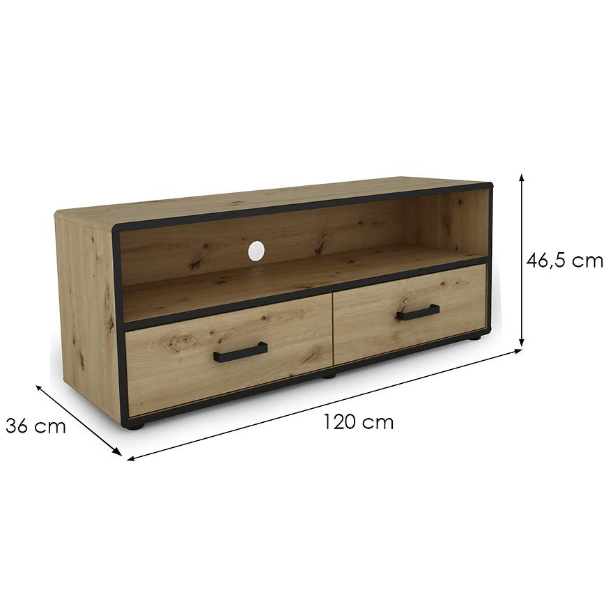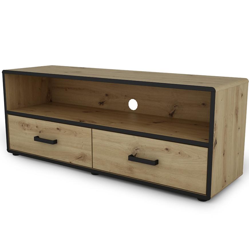 Dwie szuflady tej szafki RTV zapewniają odpowiednią ilość miejsca na przechowywanie różnorodnych przedmiotów, od pilotów po ulubione filmy czy gry. To idealne rozwiązanie dla utrzymania porządku w strefie rozrywki i elektroniki. Dzięki starannie zaprojektowanym przestrzeniom, unikniesz zagraconego wyglądu i chaosu kabli.