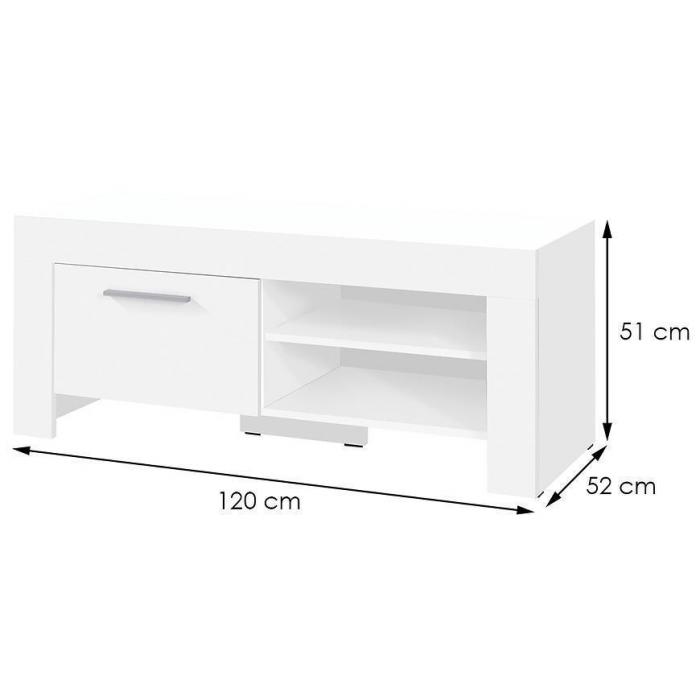 Szafka rtv w kolorze białym jedną szafkę i półki. Mebel z pewności pomieści sprzęt RTV, konsole, sprzęt grający lub piloty, ale także inne nasze drobiazgi, akcesoria, czy książki.