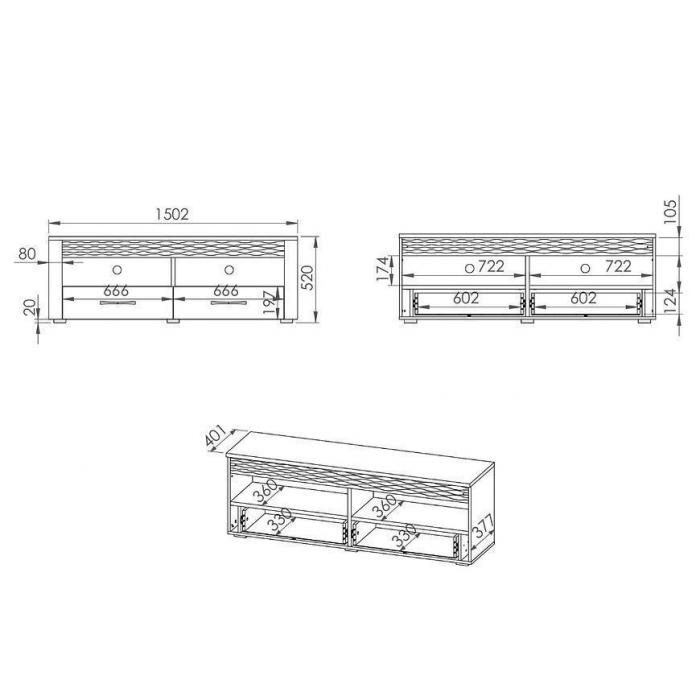 Szafka RTV z dwoma półkami i dwoma wysuwanymi szufladami to funkcjonalny mebel, który pozwala na przechowywanie urządzeń multimedialnych, a zarazem utrzymanie porządku w salonie.