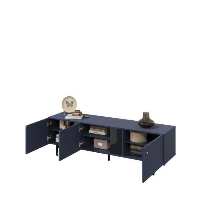 Mebel wyposażono w trzy zamykane szafki z drzwiami. Kryje się w nich sporo miejsca do przechowywania pilotów, padów czy kolekcji płyt. Blat szafki RTV to dobre miejsce do ustawienia sprzętu multimedialnego oraz wyeksponowania dekoracji i rodzinnych pamiątek. Oryginalny charakter szafki RTV to zasługa zdecydowanego wybarwienia – ciemny błękit w połączeniu z połyskującą czernią prezentuje się ciekawie i nietypowo. Zaskakująca jest też forma – smukłe nóżki, zgrabne uchwyty o barwie złota oraz zaokrąglenia na wybranych frontach nadają meblowi wyrazisty charakter.