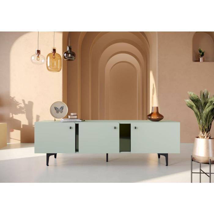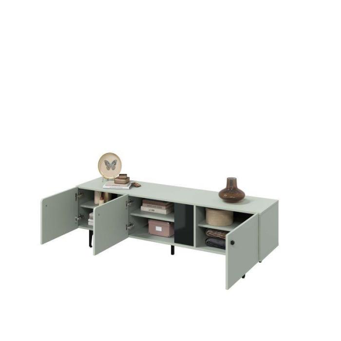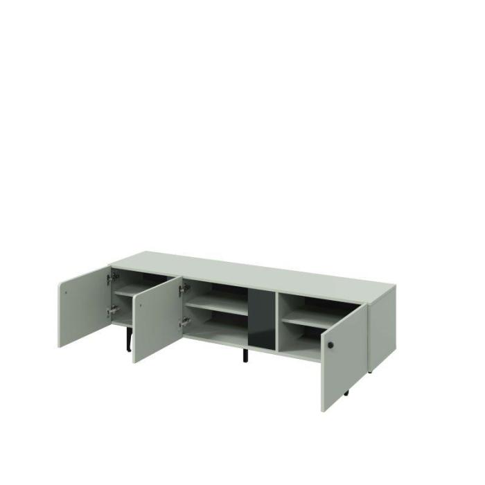 Mebel wyposażono w trzy zamykane szafki z drzwiami. Kryje się w nich sporo miejsca do przechowywania pilotów, padów czy kolekcji płyt. Blat szafki RTV to dobre miejsce do ustawienia sprzętu multimedialnego oraz wyeksponowania dekoracji i rodzinnych pamiątek. Oryginalny charakter szafki RTV to zasługa wybarwienia. Zaskakująca jest też forma – smukłe nóżki, zgrabne uchwyty w kolorze czarnym oraz zaokrąglenia na wybranych frontach nadają meblowi wyrazisty charakter.