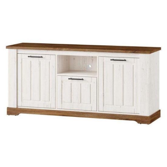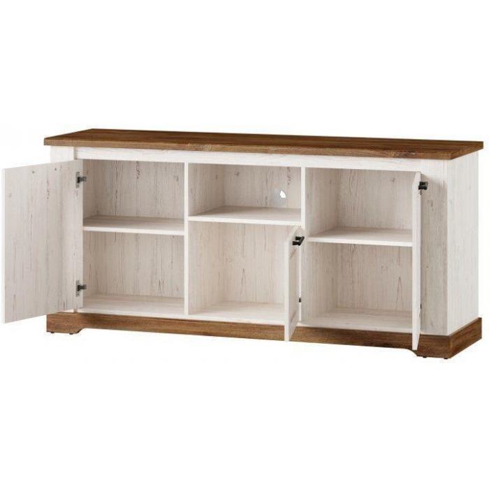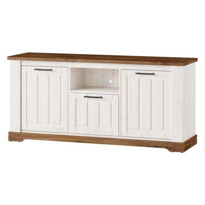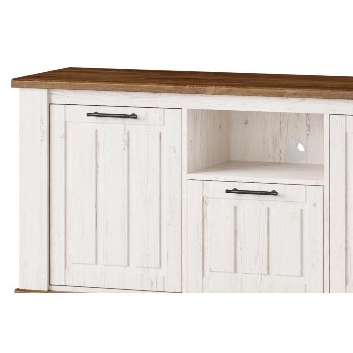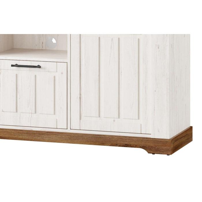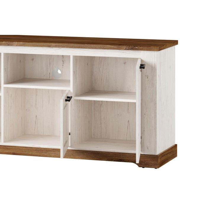 Szafka rtv Country 26 w nietypowym wydaniu kolekcji Country. Jeśli marzysz o wnętrzu w stylu prowansalskim, jeśli lubisz klasyczne bryły i zdobienia to ta kolekcja jest właśnie dla Ciebie. Niezwykle stylowy mebel, który sprawdzi się w pomieszczeniach w stylu prowansalskim oraz klasycznym. Idealna kompozycja kolorystyczna dębu stirling z sosną andersen nadaje meblowi lekkości. Szafka rtv posiada uniwersalne drzwi - dzięki czemu pasuje do każdego salonu lub jadalni.