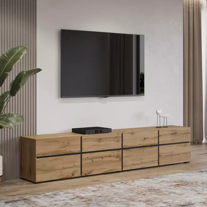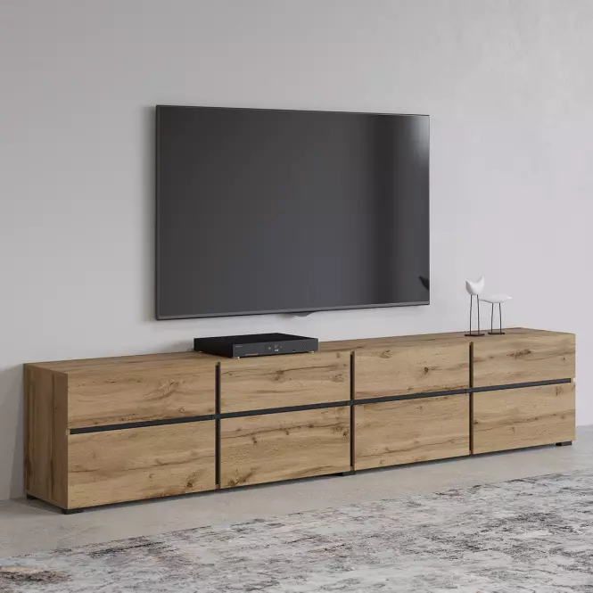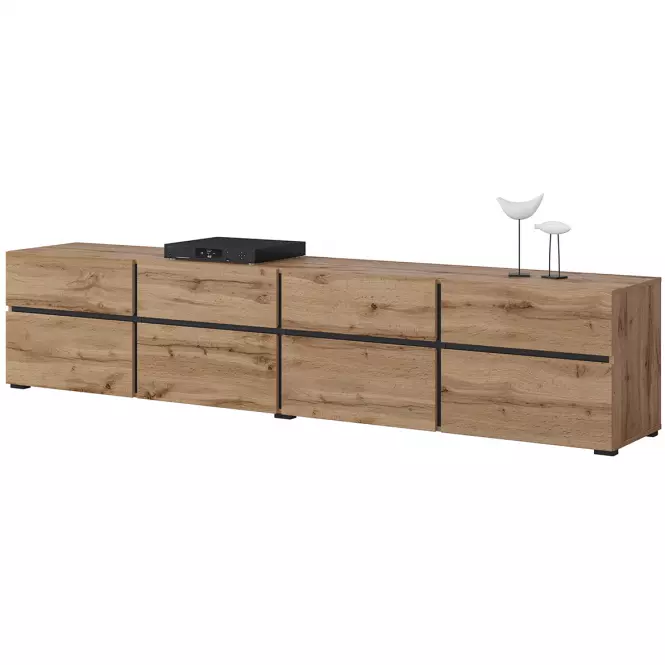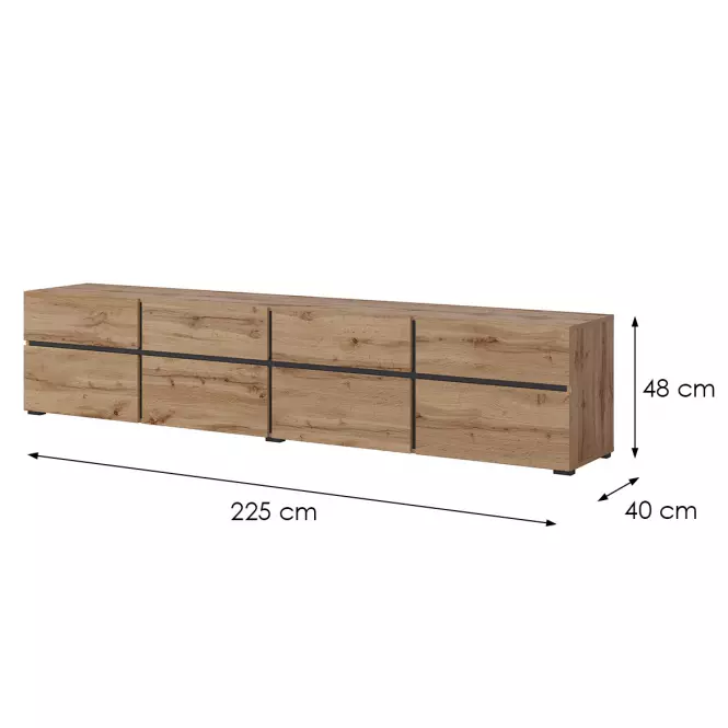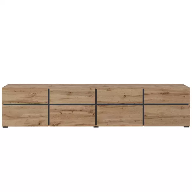 Model ten wyposażony jest w liczne szuflady i kilkudrzwiowe fronty, które pomogą utrzymać porządek wokół sprzętu multimedialnego. Przestrzeń szuflad idealnie sprawdzi się do przechowywania akcesoriów RTV, pilotów czy kabli, a zamknięte szafki z powodzeniem pomieszczą większe przedmioty, które warto mieć pod ręką. Dzięki temu organizacja strefy rozrywki staje się prosta i funkcjonalna. Szafka RTV Cross to element kolekcji CROSS, która wyróżnia się nowoczesnym stylem i przemyślaną konstrukcją – każdy detal jest tu zaprojektowany z myślą o codziennym komforcie użytkowania.