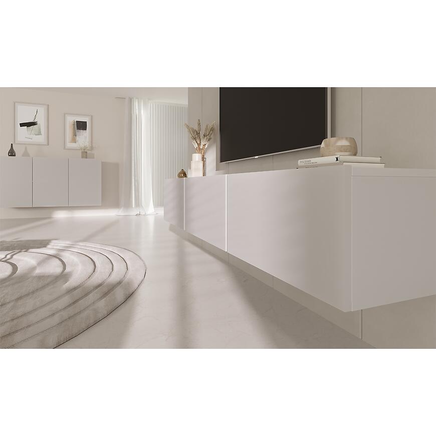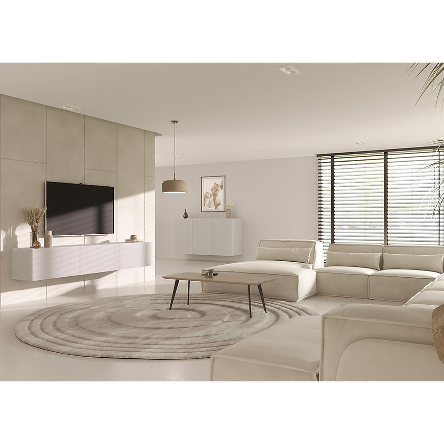Szafka RTV Dallas 160 cm w kolorze białym doskonale wpisuje się w aranżacje klasyczne i nowoczesne. Kolor świetnie komponuje się z czarnymi dodatkami, metalem oraz betonem, tworząc spójną i modną przestrzeń.