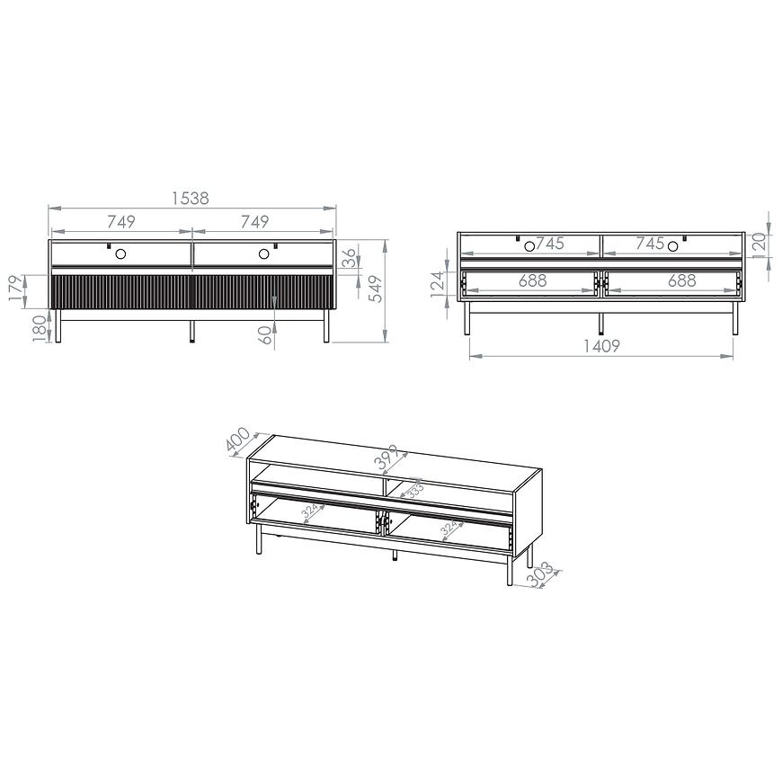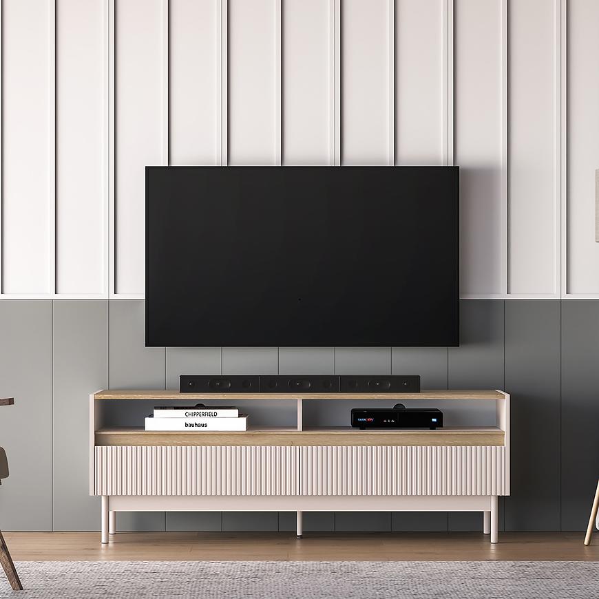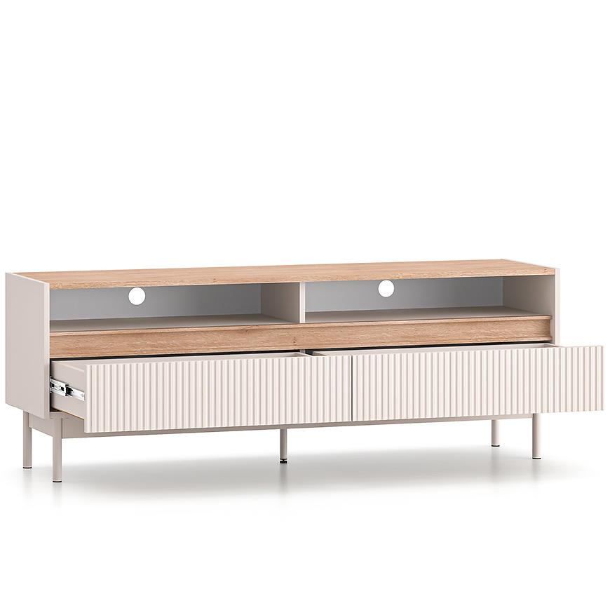 Szafka RTV Dunea 07 Cashmere to nowoczesny mebel o eleganckim, beżowym wybarwieniu, łączący matowe fronty MDF w kolorze cashmere z korpusem w dekorze cashmere/dąb cremona. Dzięki dwóm pojemnym szufladom zapewnia funkcjonalne przechowywanie, a szerokość 154 cm sprawia, że idealnie sprawdzi się pod telewizorem. Stylowa i praktyczna, wymaga samodzielnego montażu.