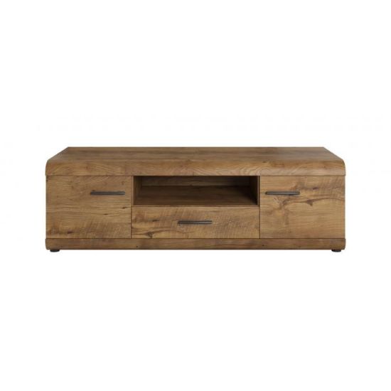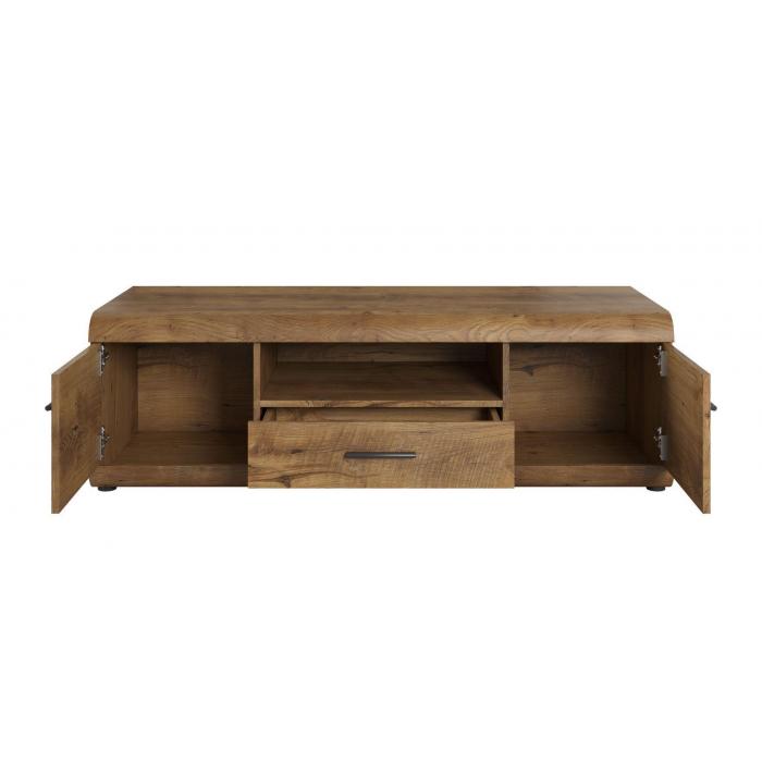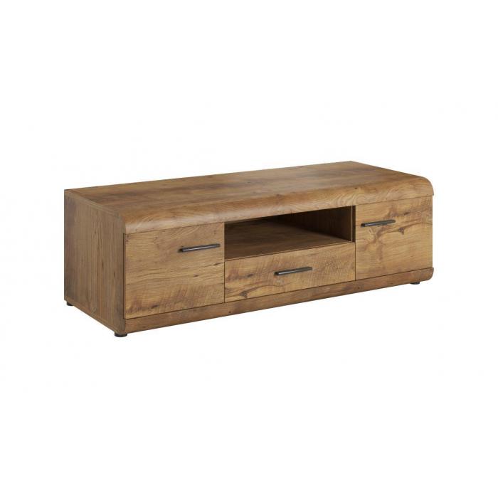 Szafka RTV posiada dwie zamykane szafki, szufladę oraz jedną otwartą półkę.