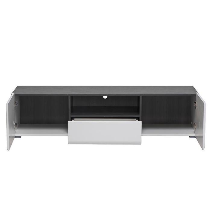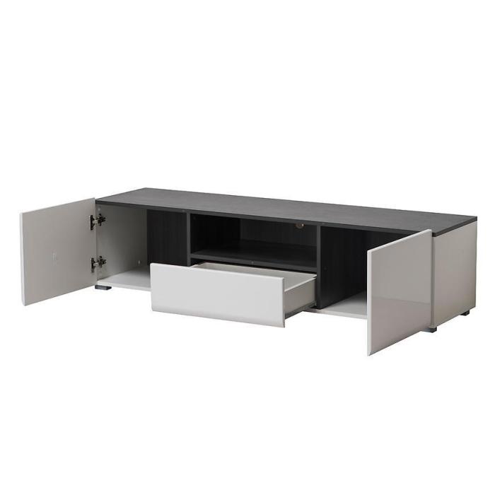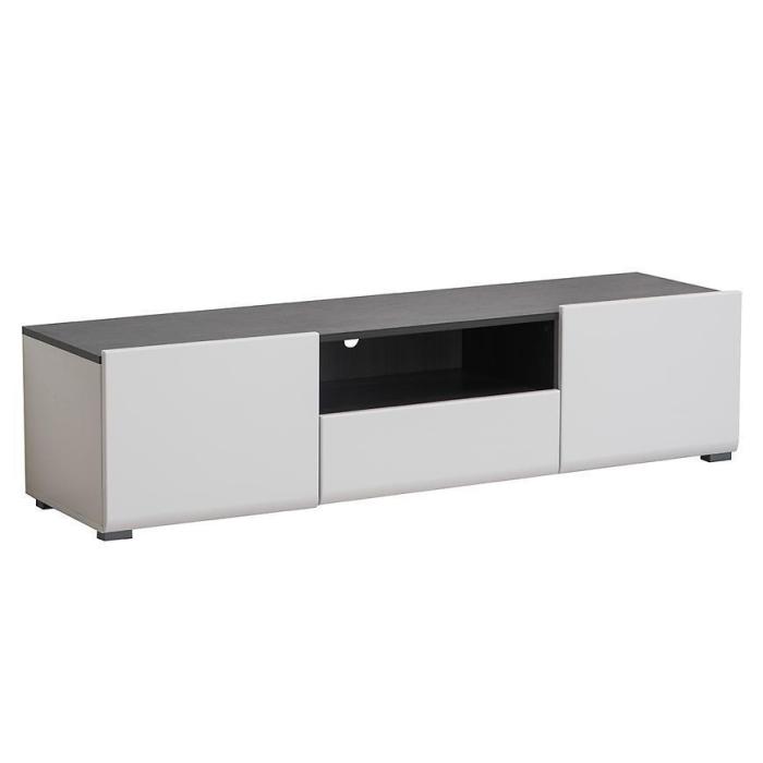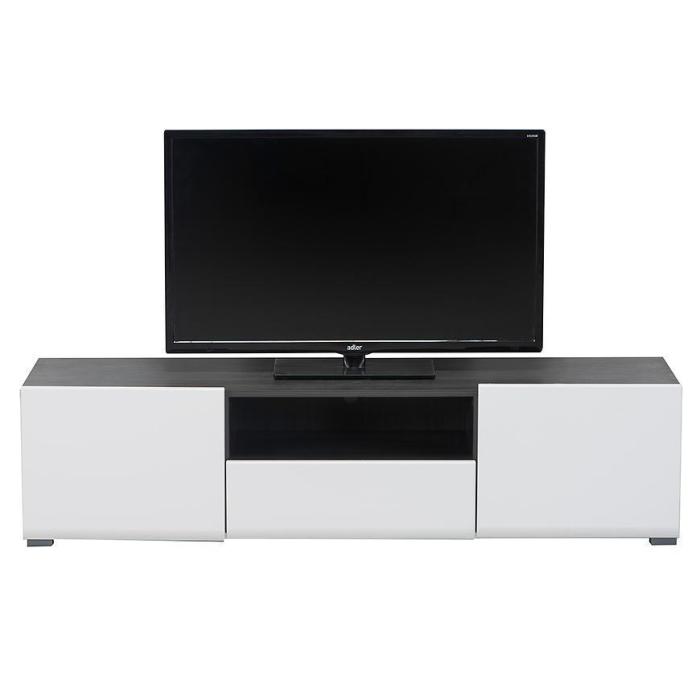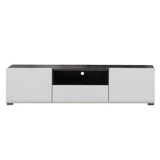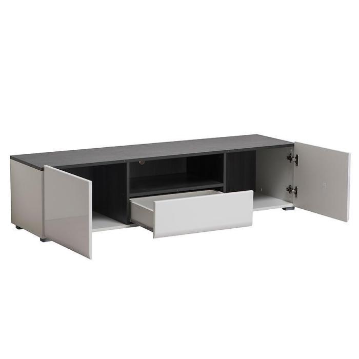 Szafka RTV Enzo w kolorze białym to nowoczesny mebel o lekkiej, eleganckiej formie. Połączenie białych frontów w połysku z korpusem w kontrastowym zestawieniu bieli i czerni nadaje całości wyrazisty, a jednocześnie uporządkowany charakter.