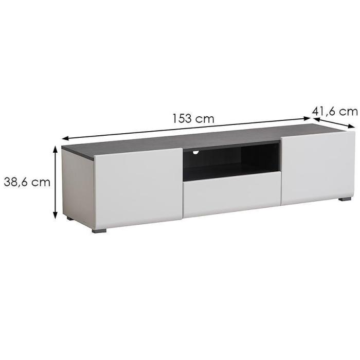 Szerokość 153 cm zapewnia praktyczną powierzchnię do ustawienia sprzętu multimedialnego oraz akcesoriów. Niska wysokość 38,6 cm sprawia, że mebel prezentuje się lekko i nowocześnie w strefie RTV.