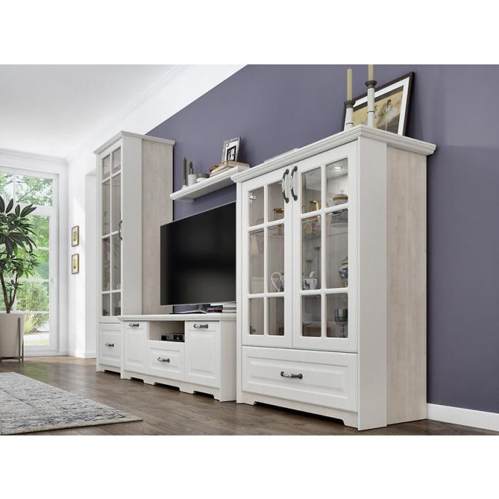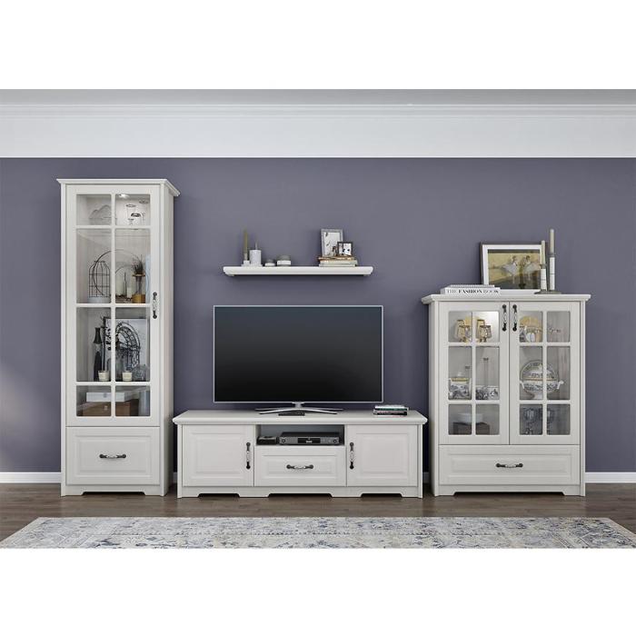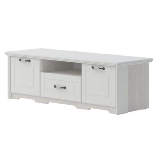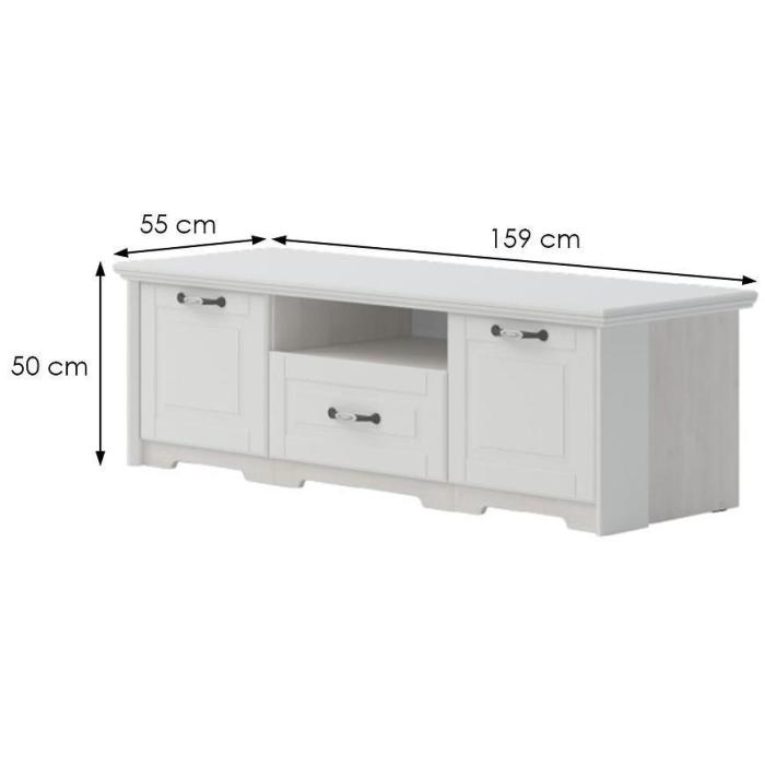 Kolekcja Evergreen w kolorze polar pine/ivory świetnie prezentuje się w klasycznych wnętrzach. Szafka rtv doskonale sprawdzi się w każdym salonie lub innym, dowolnym pomieszczeniu. Wykonana jest z płyty MDF lakierowanej/wiórowej lakierowanej.
