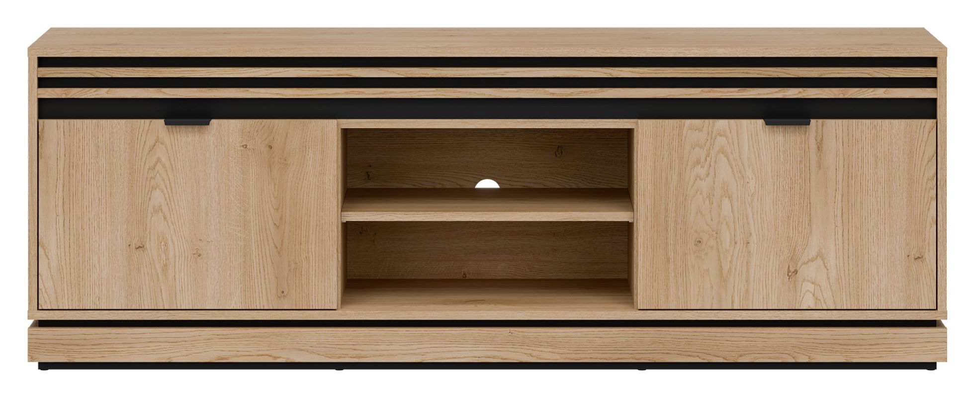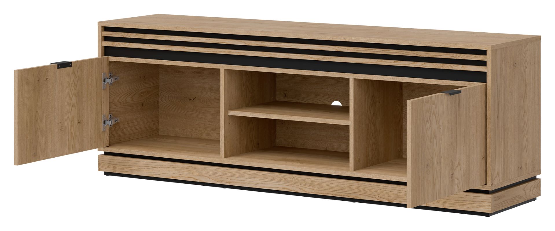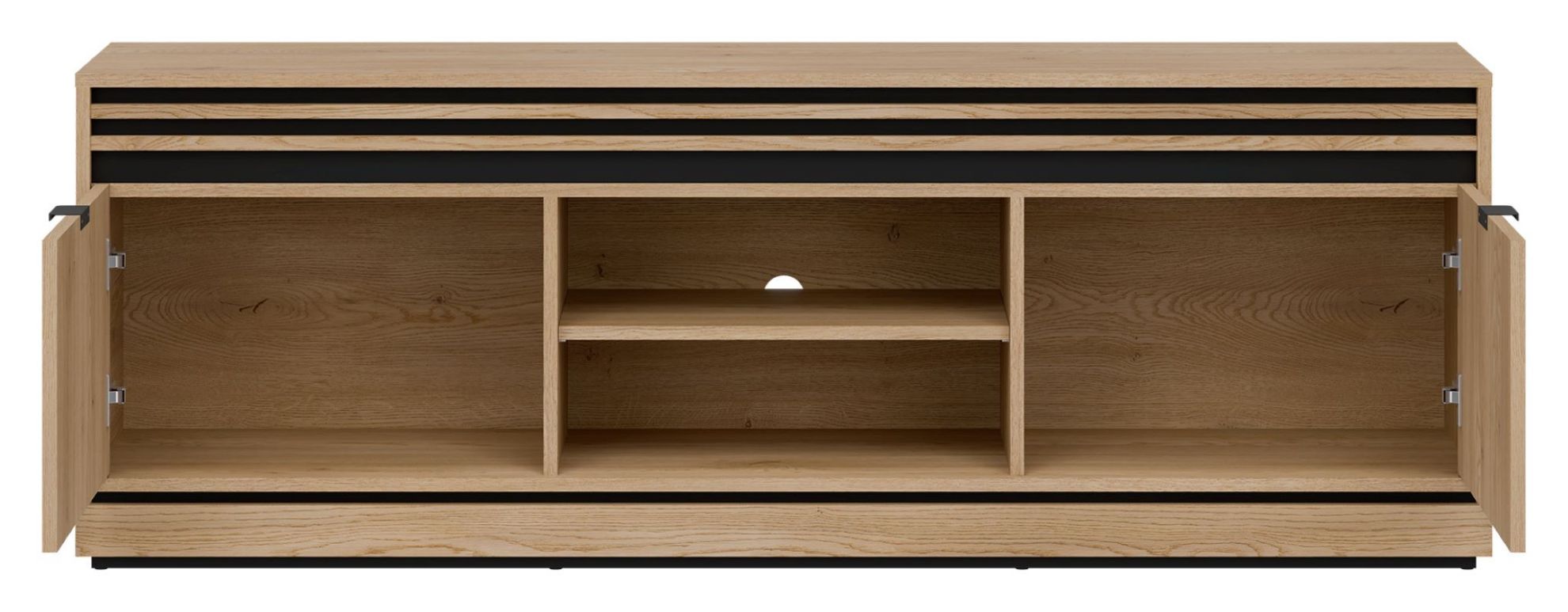 Pozostałe fronty wyposażono w metalowe uchwyty w kolorze czarnym, które doskonale współgrają z nowoczesnym charakterem mebli, a zawiasy z systemem cichego domyku zapewniają bezgłośne zamykanie i zwiększoną wygodę użytkowania.