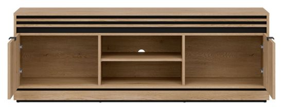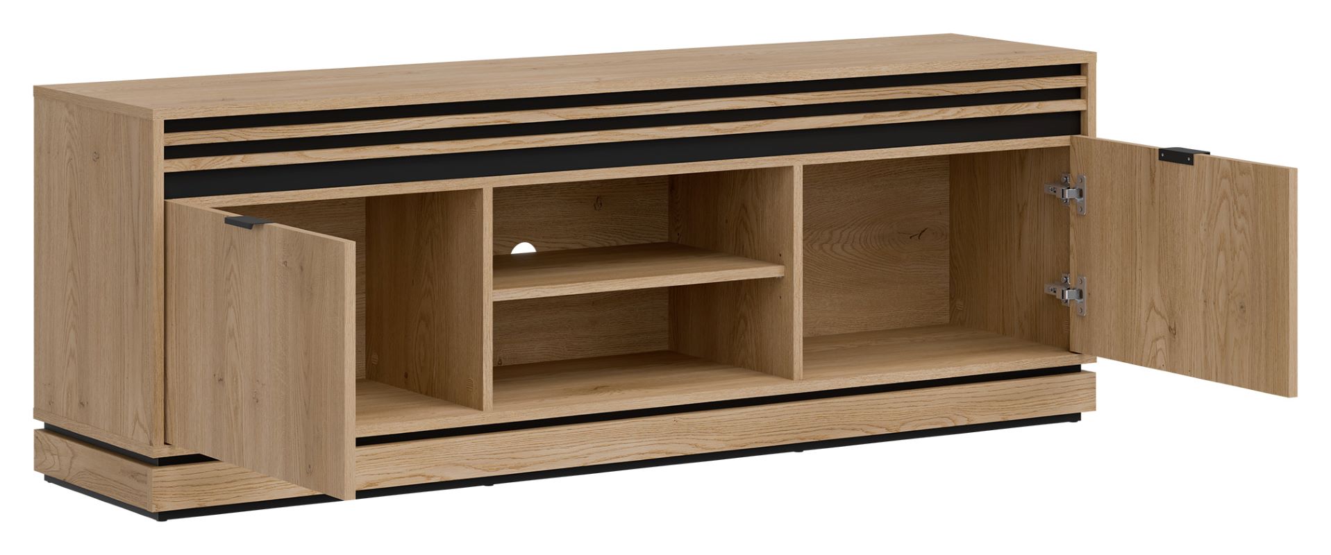 Projektując serię Ferro, postawiono na detale i funkcjonalność. Szuflady wyposażono w prowadnice kulkowe z pełnym wysuwem, co zapewnia wygodny dostęp do zawartości i płynne użytkowanie na co dzień. W górnych drzwiach mebli oraz szufladach zastosowano nowoczesny system push-to-open, pozwalający na otwieranie bez uchwytów – wystarczy lekkie naciśnięcie frontu. Pozostałe drzwi wyposażono w metalowe uchwyty w kolorze czarnym, które doskonale komponują się z całością kompozycji i podkreślają surowy, industrialny styl kolekcji.