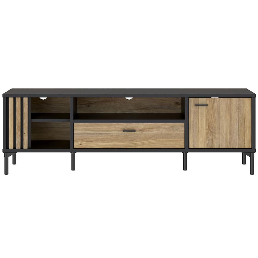 Kolor frontów w odcieniu dąb mauvella w połączeniu z czernią dodaje elegancji i nowoczesności. Zarówno fronty, jak i korpus szafki RTV są wykończone matową powłoką, co podkreśla ich stylowy charakter. Konstrukcja frontów i korpusu wykonana jest z trwałej płyty wiórowej laminowanej, gwarantując solidność i trwałość.