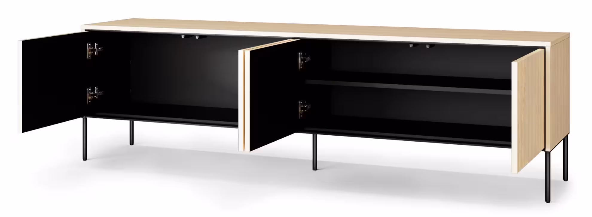 Szafka RTV Flow FW-05 jest czterodrzwiowa i bez szuflad, a wewnątrz posiada jedną półkę, co daje elastyczną przestrzeń do przechowywania większych przedmiotów. Układ półek został zaprojektowany tak, aby odpowiadał realnym potrzebom domowników – sprzęt RTV, akcesoria i dekoracje można wygodnie posegregować, zachowując porządek i estetykę wnętrza.