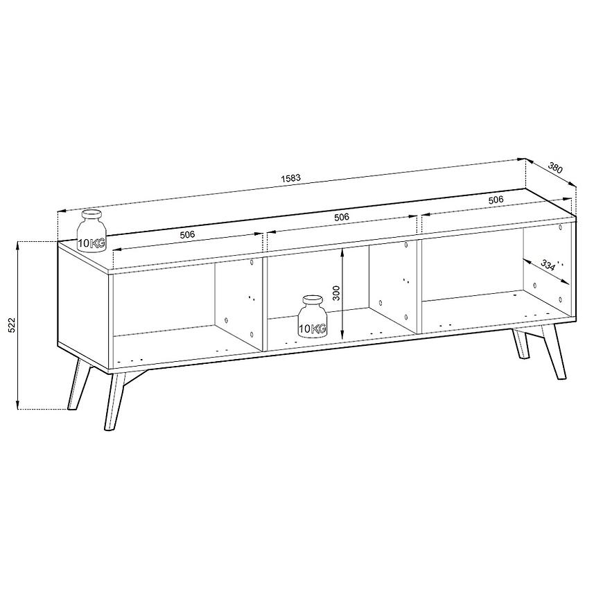 Szafka RTV wyposażona jest w trzy solidne drzwi, które pomieszczą wiele różnych urządzeń elektronicznych oraz akcesoriów, a także ukryją kable i przewody, zapewniając uporządkowany wygląd przestrzeni wokół telewizora. Dzięki zastosowaniu wysokiej jakości płyty wiórowej laminowanej, szafka jest trwała i odporna na uszkodzenia, co zapewnia długotrwałą satysfakcję z użytkowania.