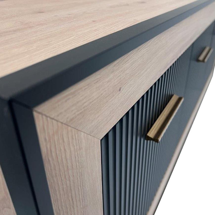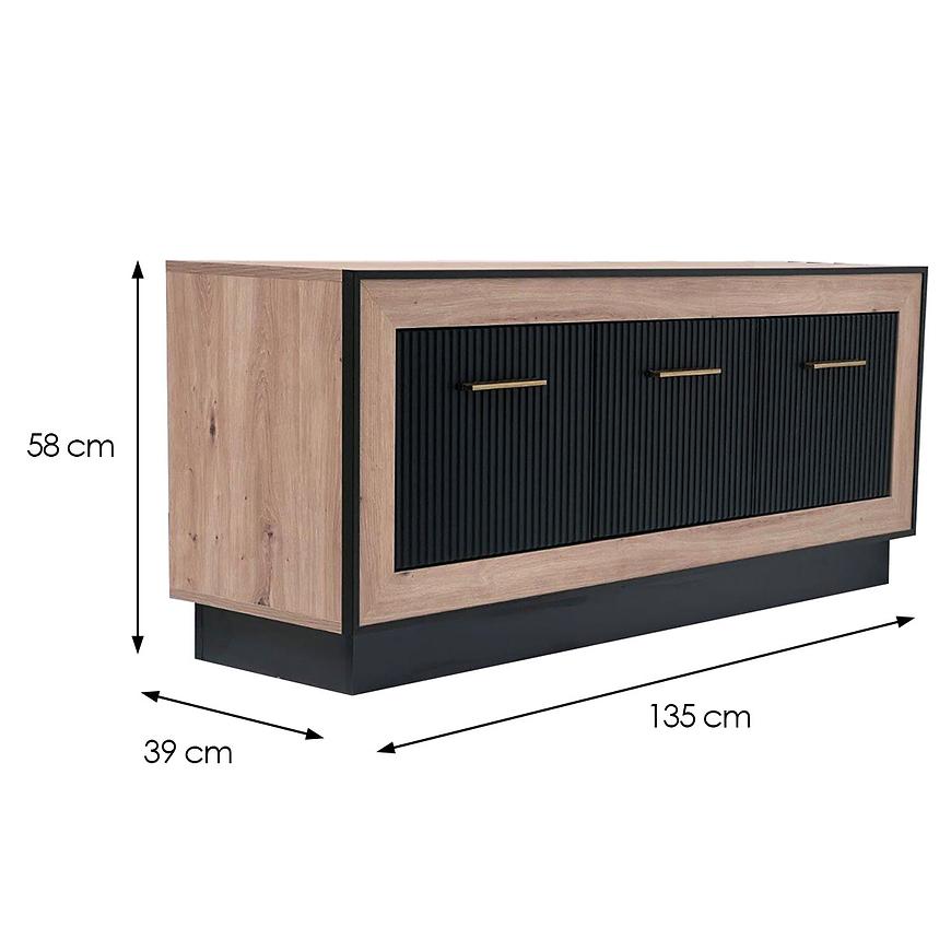Zastosowanie wysokiej jakości materiałów, tj. płyta MDF oraz płyta wiórowa laminowana, zapewnia trwałość i wytrzymałość mebla, gwarantując długotrwałe użytkowanie. Wymiary szafki RTV Fox 4 to 58 cm wysokości, 135 cm szerokości i 39 cm głębokości, co czyni ją idealnym rozwiązaniem do przechowywania różnego rodzaju sprzętu RTV oraz akcesoriów. Szafka RTV jest wyposażona w trzydrzwiowy system, co umożliwia wygodne przechowywanie przedmiotów i organizację przestrzeni.